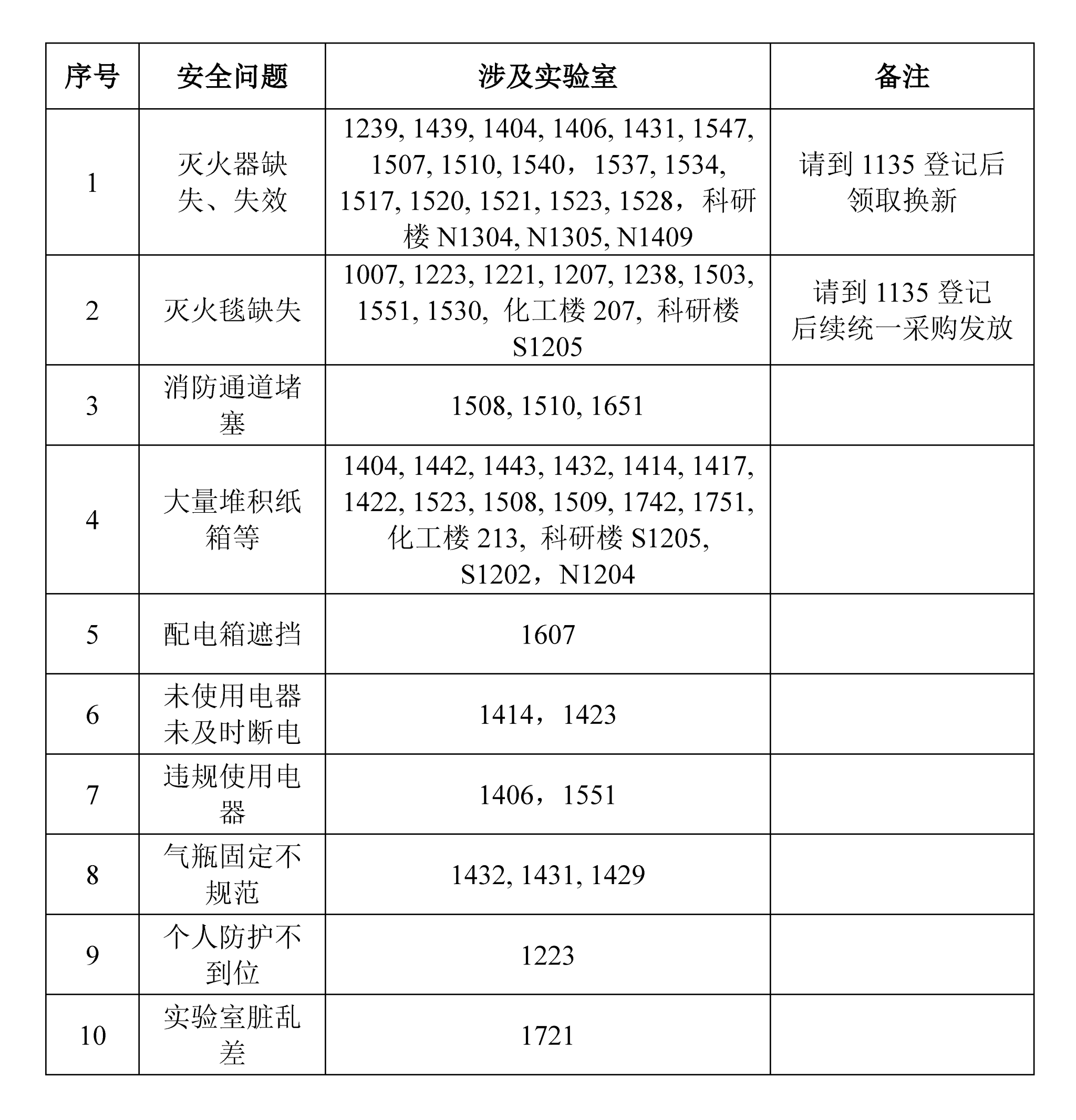 本次安全检查结果表明,大量实验室存在灭火器失效/缺失、灭火毯缺失、大量纸箱堆积等情况,个别实验室仍存在配电箱遮挡、违规使用电器、气瓶固定不到位等问题。现将具体检查情况通报如下,请相关实验室严格按照安全规范及时整改,消除安全隐患从而保障实验室的安全运行。