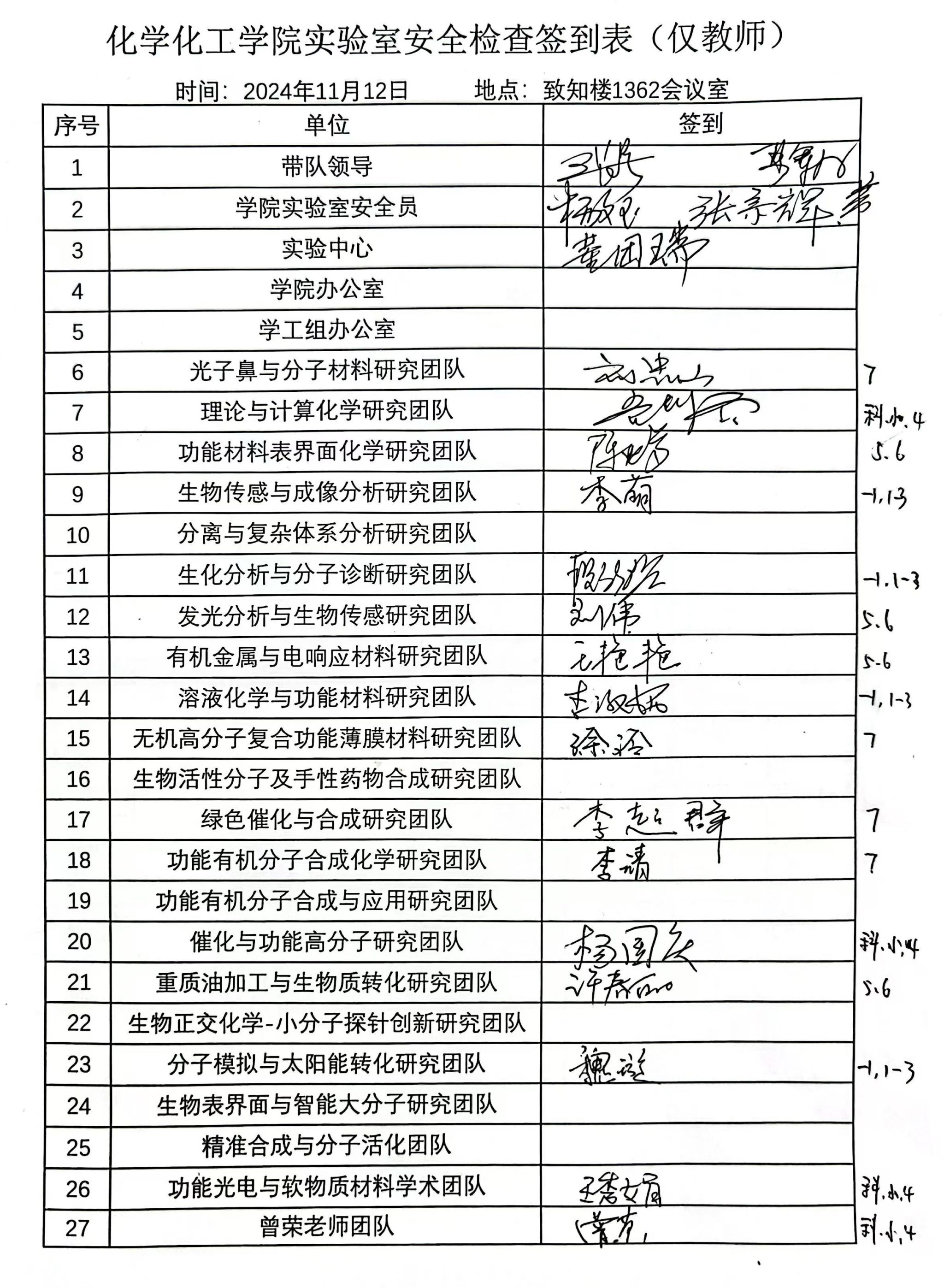11月12日下午,学院组织进行了消防安全月实验室安全检查工作,此次检查以消防安全为重点内容。学院副院长王长号、应用表面与胶体化学教育部重点实验室副主任严军林、安全工作委员会副主任杨文玉、各科研团队教师代表和学生代表约30余人参加。王长号通报了楼层内消防缓冲区的改造情况,详细介绍了本次检查的内容和要求。严军林强调对科研助理和联培学生需要实验室安全培训,以保证所有进入实验室的人员具有安全意识和防护举措。杨文玉将日常安全检查的整体情况进行了反馈并提出改进意见。随后,各检查小组分别对致知楼、化工楼小三层、科研大楼的科研实验室、教学实验室、公共区域逐一进行检查。