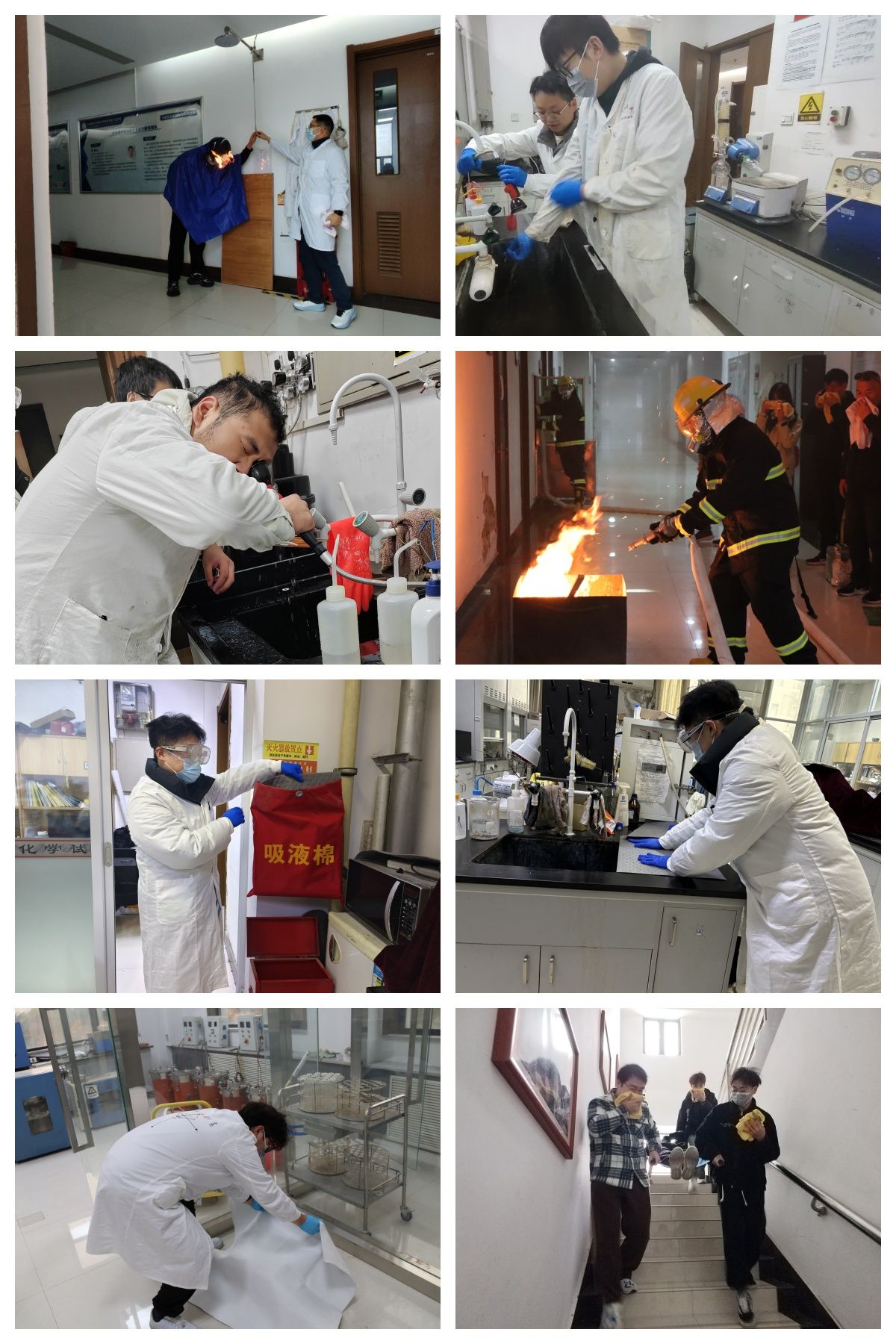 在应急疏散过程中,各楼层设计了应急救助和紧急情况处理项目,包括伤员救治、使用消防栓处理大火情、易制毒试剂打碎的应急处置、使用消防沙处理小火情、喷淋设备应急使用、洗眼器应急使用、实验室人员被困的破门救助等项目。各个应急演练项目环环相扣,设计合理、处置恰当,充分锻炼了学院师生的应急处置能力。