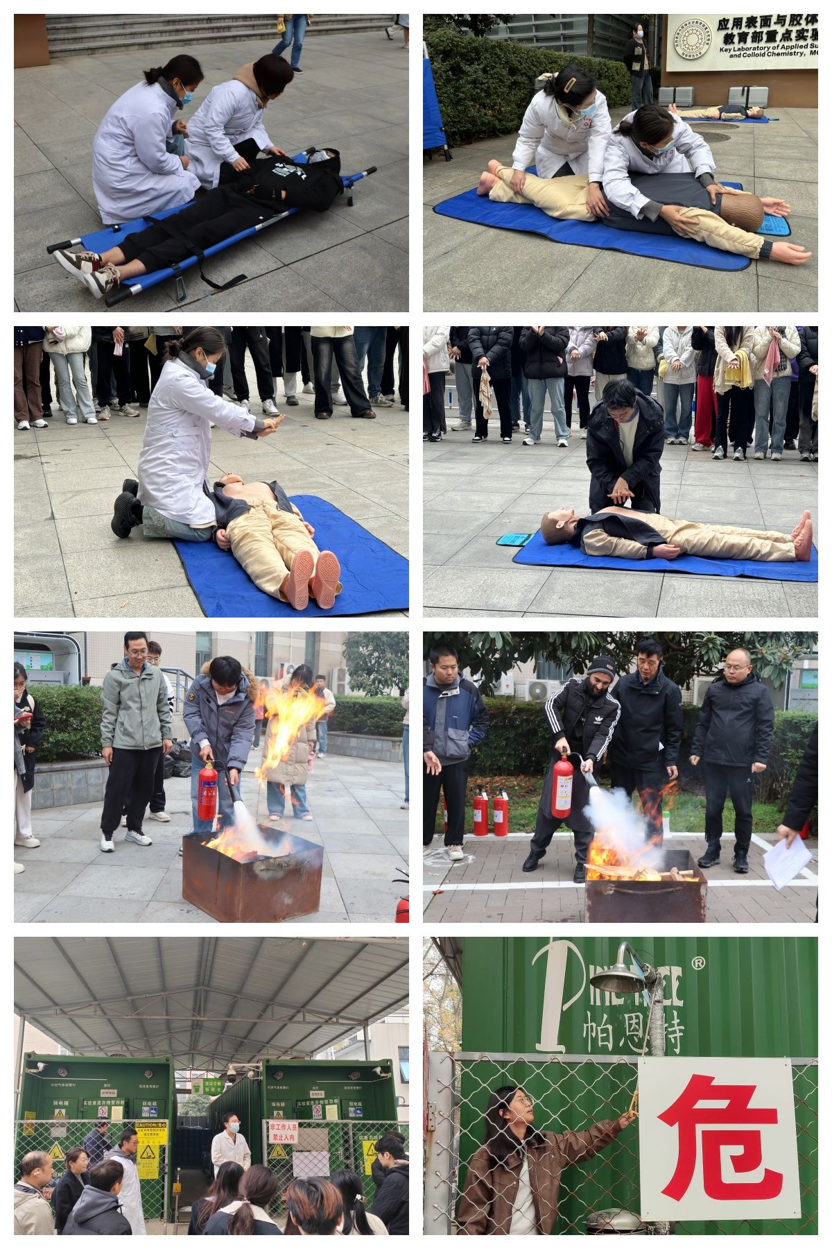 第二阶段为分组进行应急救助培训。第一组是2021级本科生、留学生、科研助理,第二组是2023级硕士和博士生,第三组是2024级硕士生和博士生。培训分为三项,一是灭火项目,包括灭火毯、灭火器演练;二是医学紧急救助,包括心肺复苏和医疗应急包使用;三是喷淋装置和洗眼器使用,三组参与人员逐一完成理论学习和实践操作。校医院医疗技术人员,学院副院长肖新军专门就心肺复苏这一关键急救技术,按照“判断患者反应、纠正患者体位、判断脉搏、胸外按压、开放气道、人工呼吸”6个步骤向师生进行了现场示范;实验中心相关老师向师生演示了灭火器、灭火毯等消防器材的使用方法和注意事项;各楼层负责老师指导并监督喷淋和洗眼器装置的使用。国际交流处全体人员参加了灭火毯、灭火器演练的灭火项目。