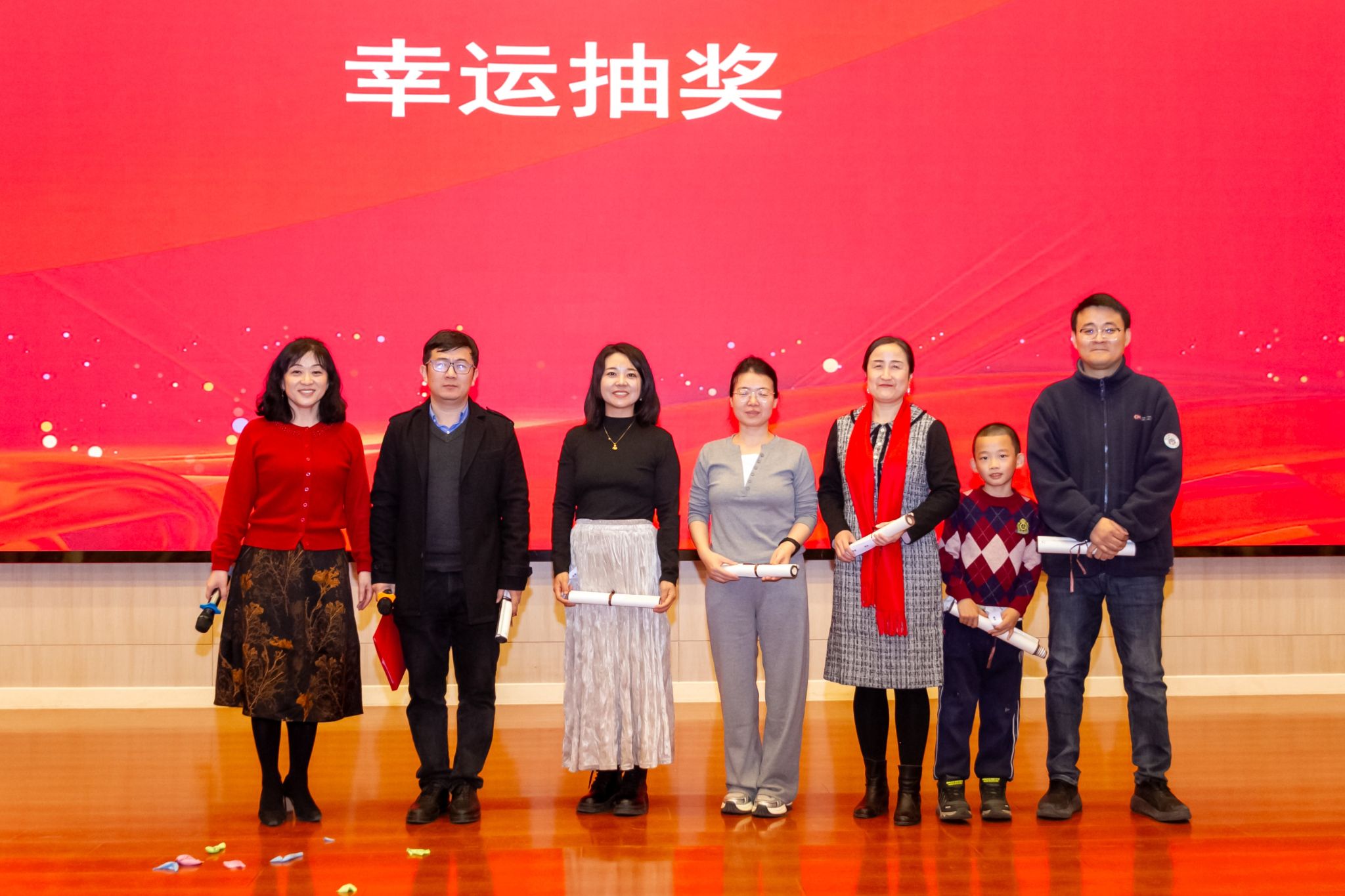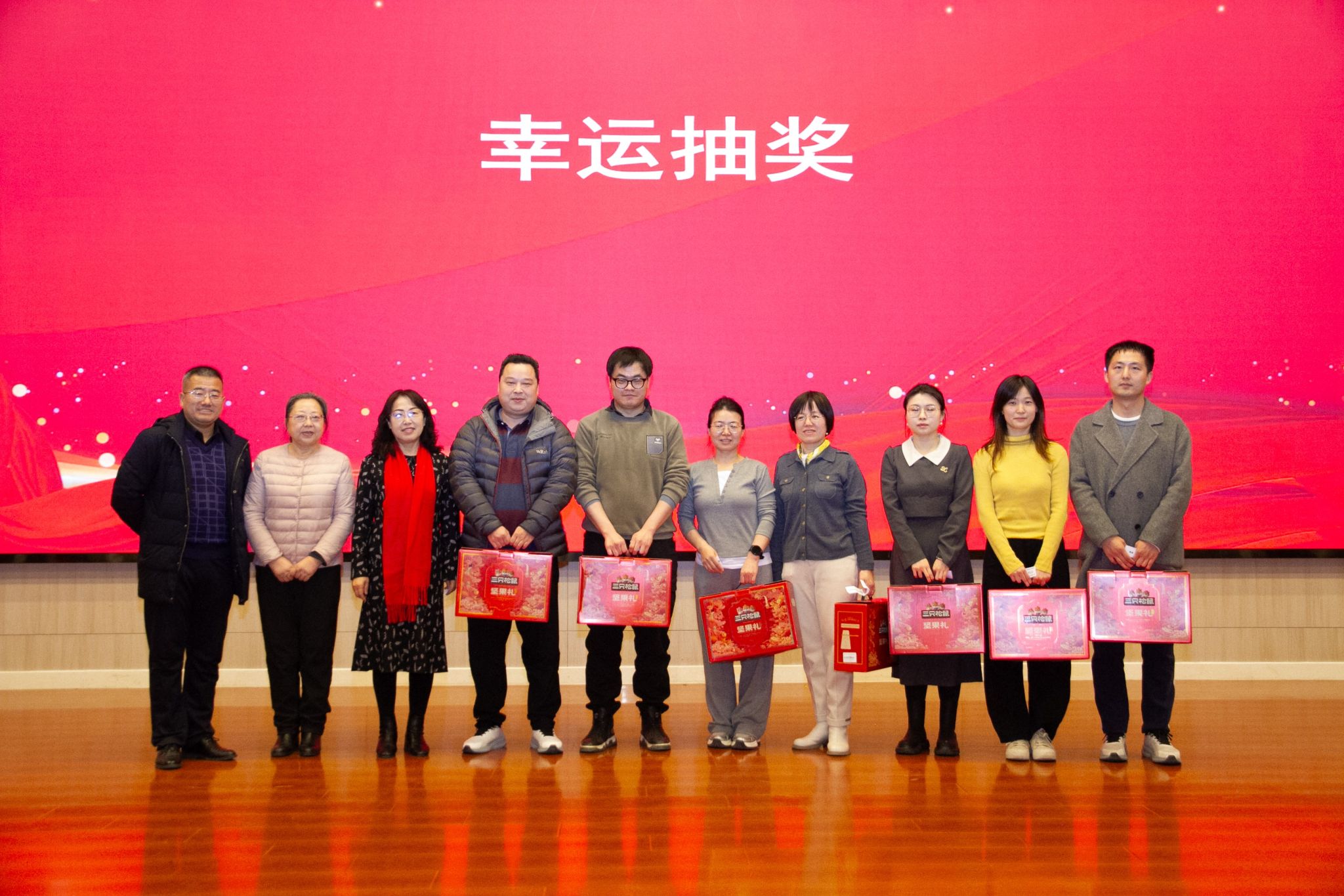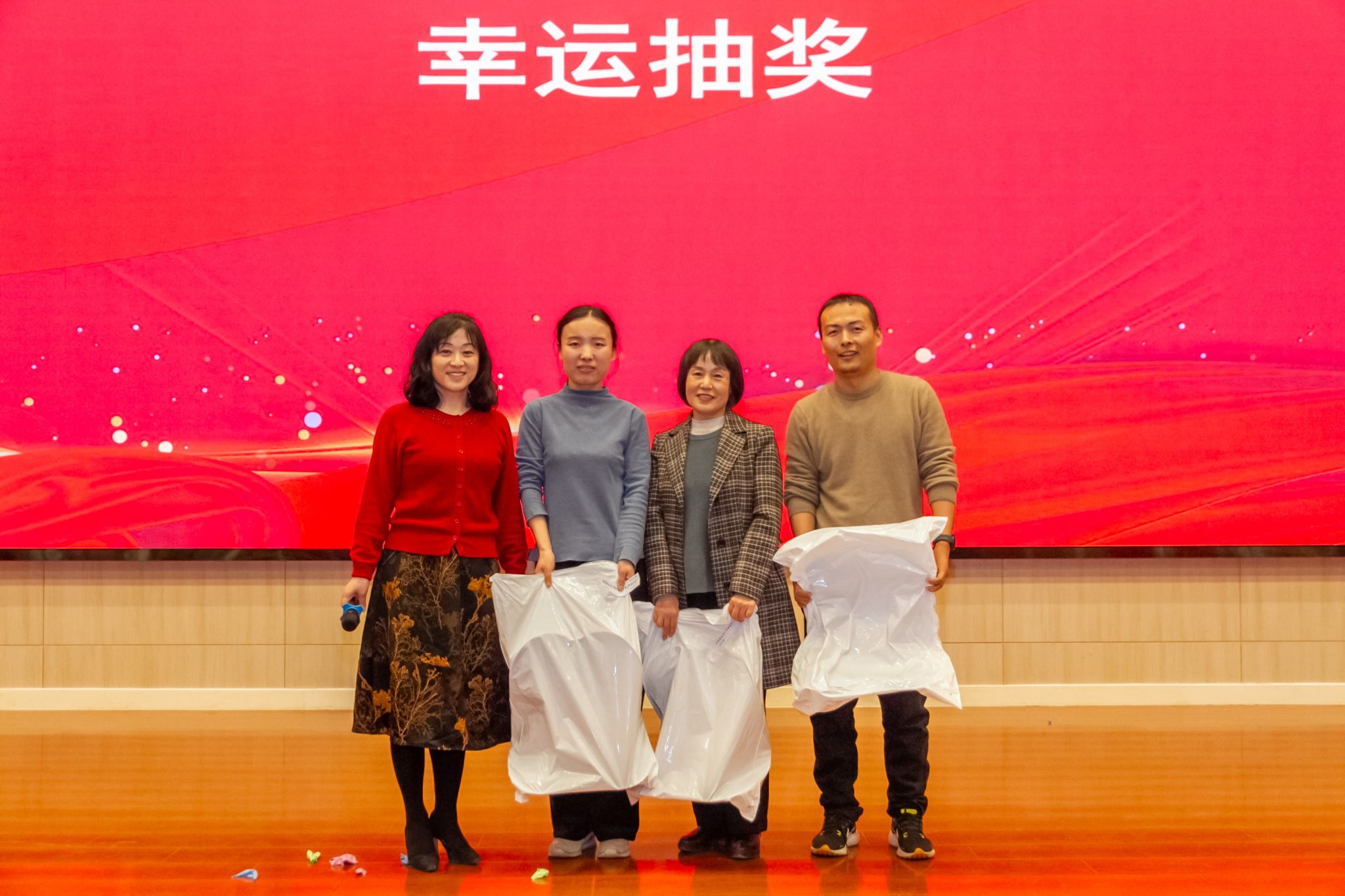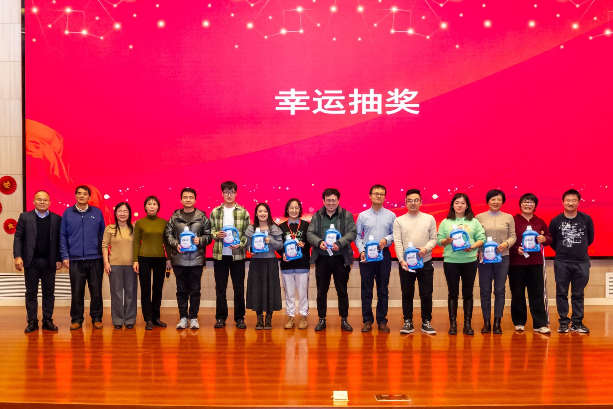 联谊会上,趣味互动的各类游戏接连不断。《东拼西凑》、《一块五》游戏现场欢声笑语、气氛活跃;《心心相印》、《夹气球》老师们两两搭档,尽显默契与合作;《猜猜看》你抢我答,《击鼓传花》热闹非凡。联谊会上的抽奖环节是联谊会上最激动人心的环节之一,学院领导和教师代表为获奖教职工送上新年祝福。