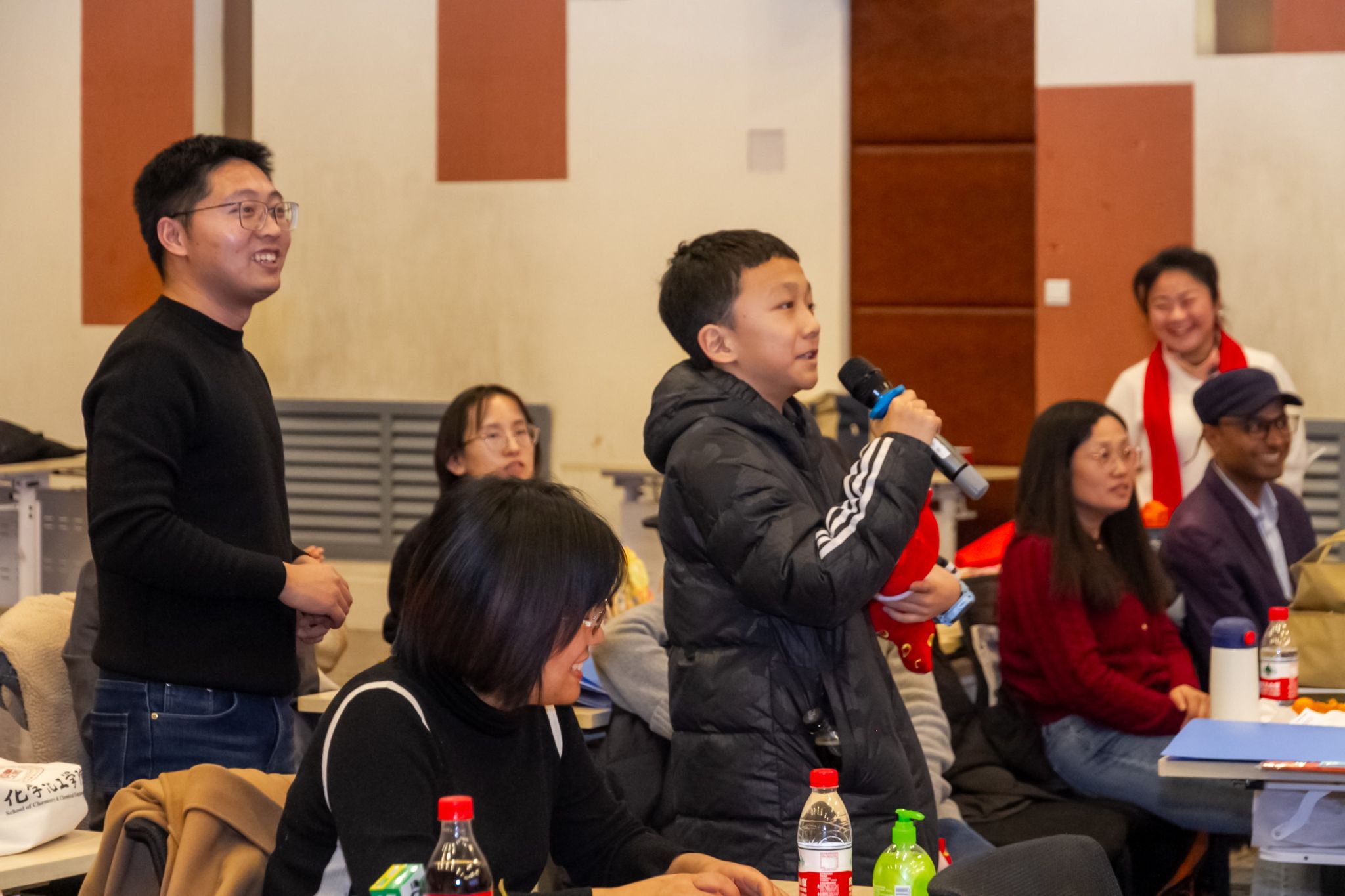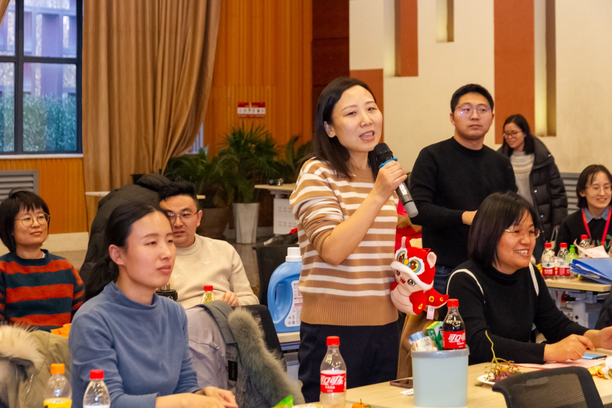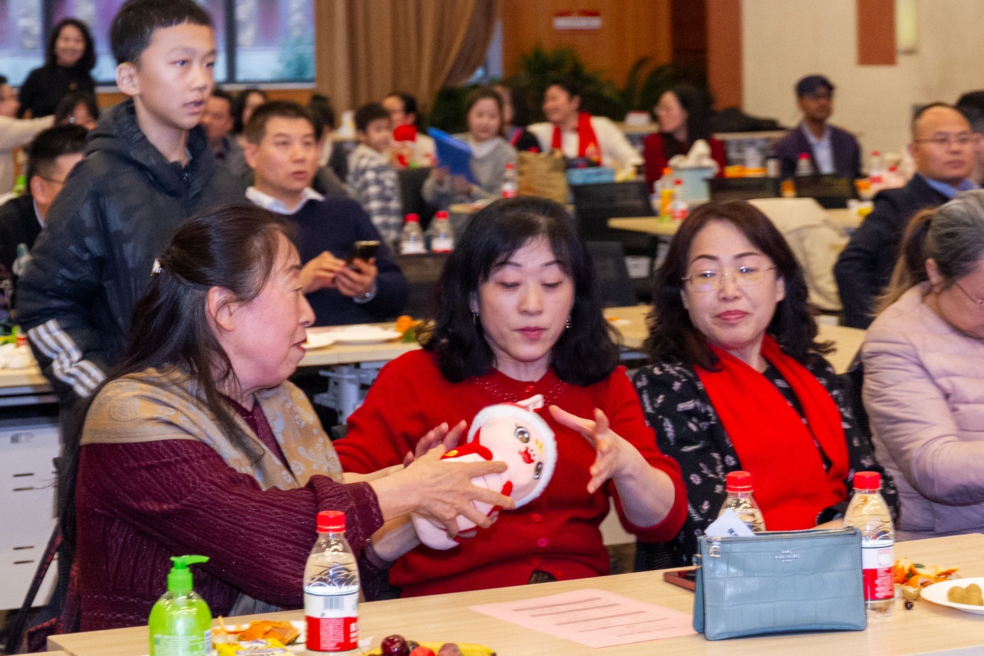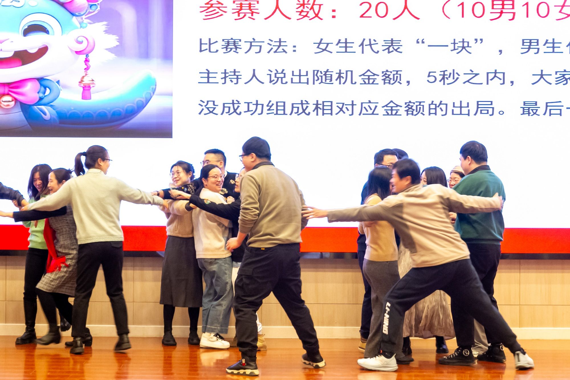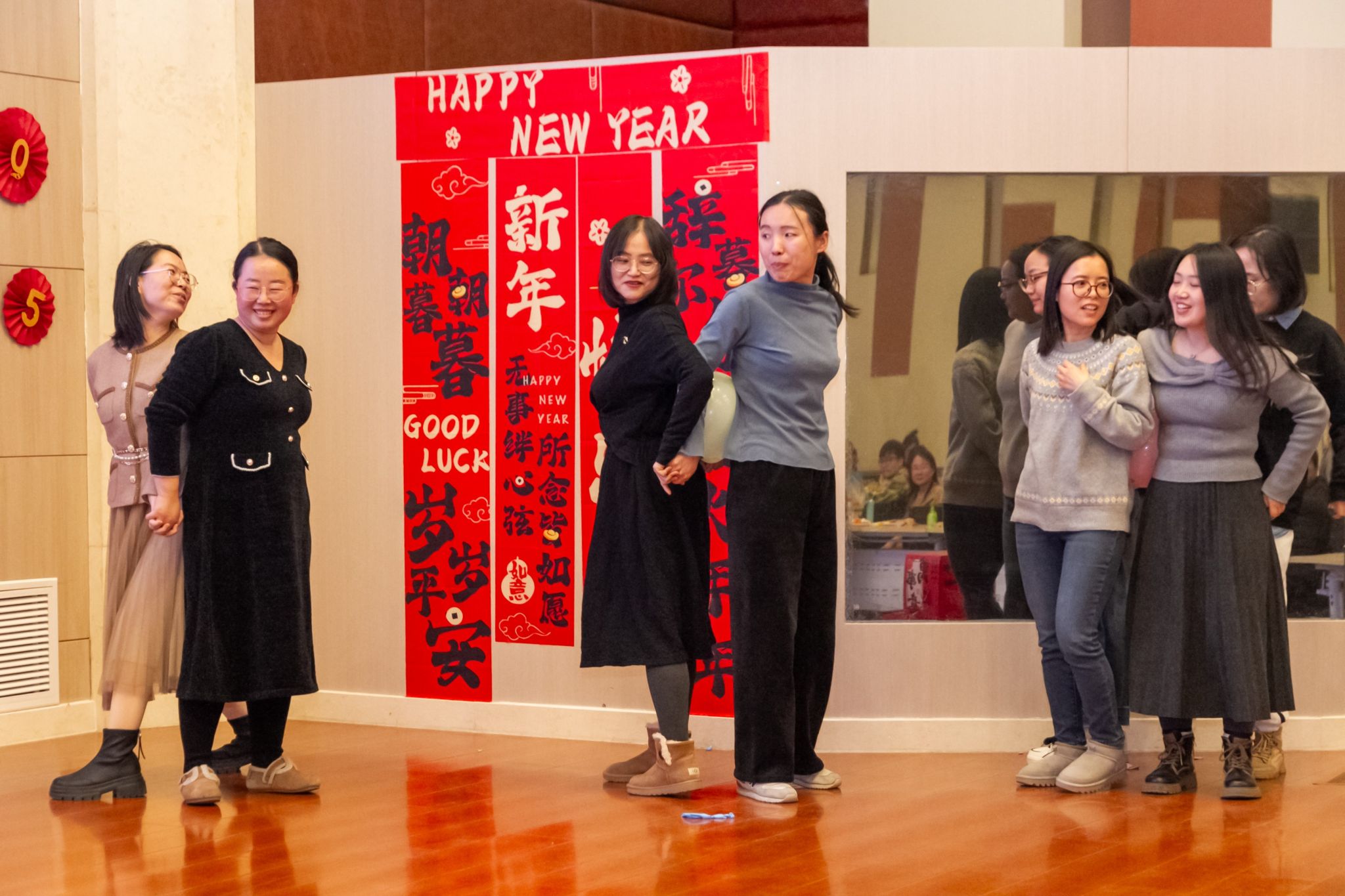 联谊会上,趣味互动的各类游戏接连不断。《东拼西凑》、《一块五》游戏现场欢声笑语、气氛活跃;《心心相印》、《夹气球》老师们两两搭档,尽显默契与合作;《猜猜看》你抢我答,《击鼓传花》热闹非凡。联谊会上的抽奖环节是联谊会上最激动人心的环节之一,学院领导和教师代表为获奖教职工送上新年祝福。