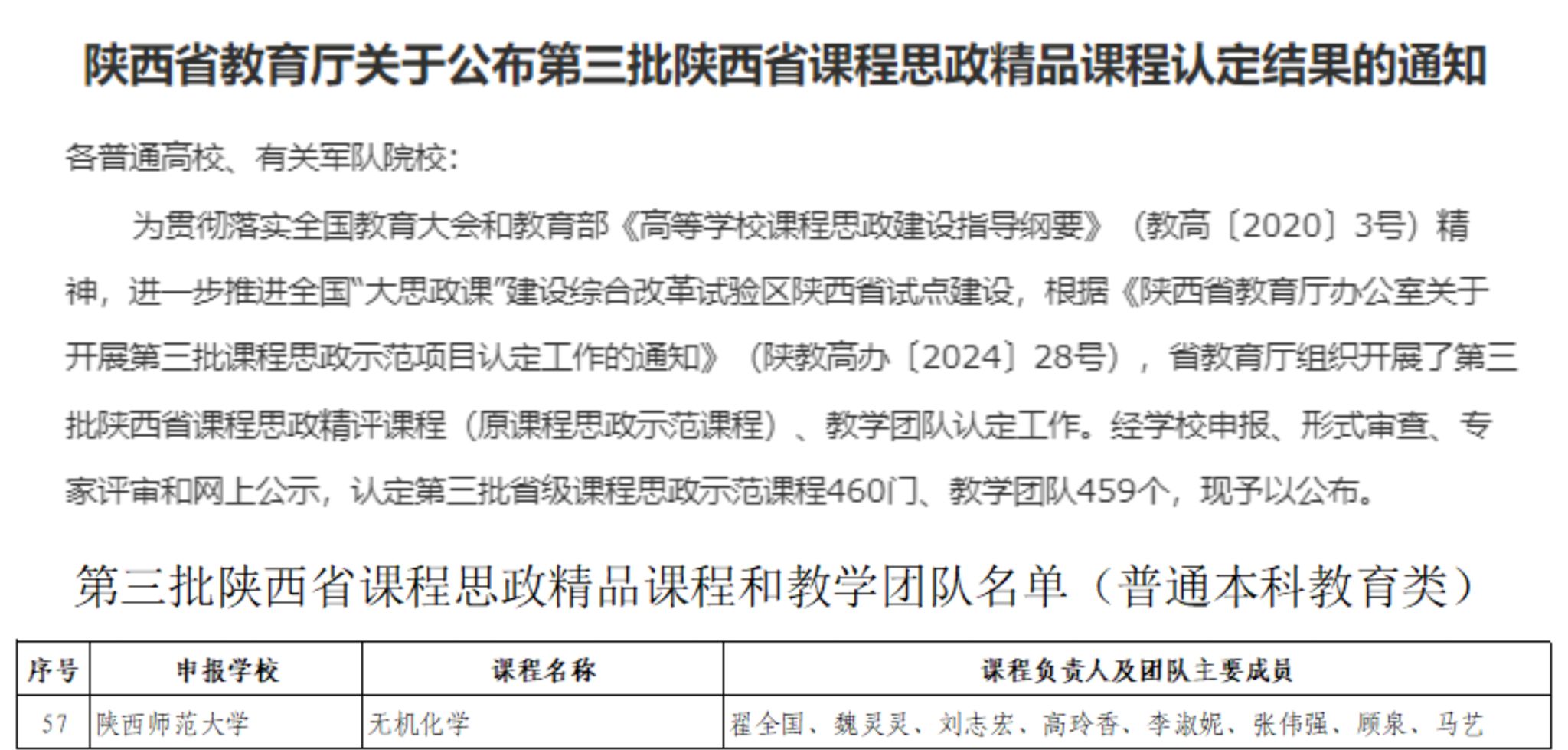 近日,陕西省教育厅发布了《陕西省教育厅关于公布第三批陕西省课程思政精品课程认定结果的通知》,香蕉视频 翟全国教授主持的《无机化学》课程成功入选,该课程教学团队同时被认定为陕西省课程思政教学团队。