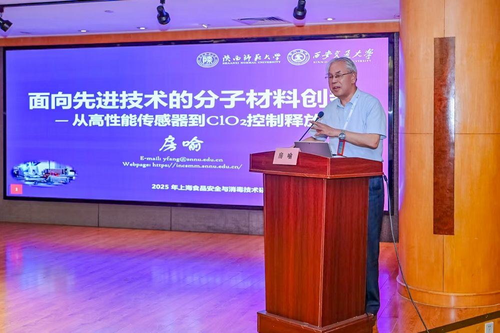 房喻院士应邀作题为“面向先进技术的分子材料创新:从高性能传感器到ClO2控制释放”的报告。本次研讨会由上海市食品安全工作联合会食品安全与消毒专业委员会主办,相关事业单位、协会、食品生产、餐饮、消毒企业、检测机构代表等百余人参会。