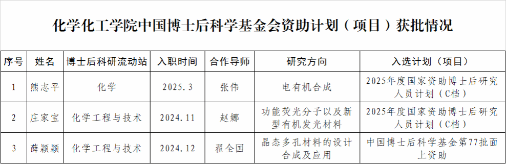 化学博士后科研流动站熊志平博士后、化学工程与技术博士后科研流动站庄家宝博士后获批2025年度国家资助博士后研究人员计划(C档),香蕉视频