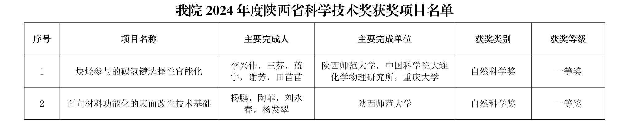 李兴伟教授团队的“炔烃参与的碳氢键选择性官能化”成果和杨鹏教授团队的“面向材料功能化的表面改性技术基础”成果获陕西省自然科学奖一等奖。这是近年来香蕉视频