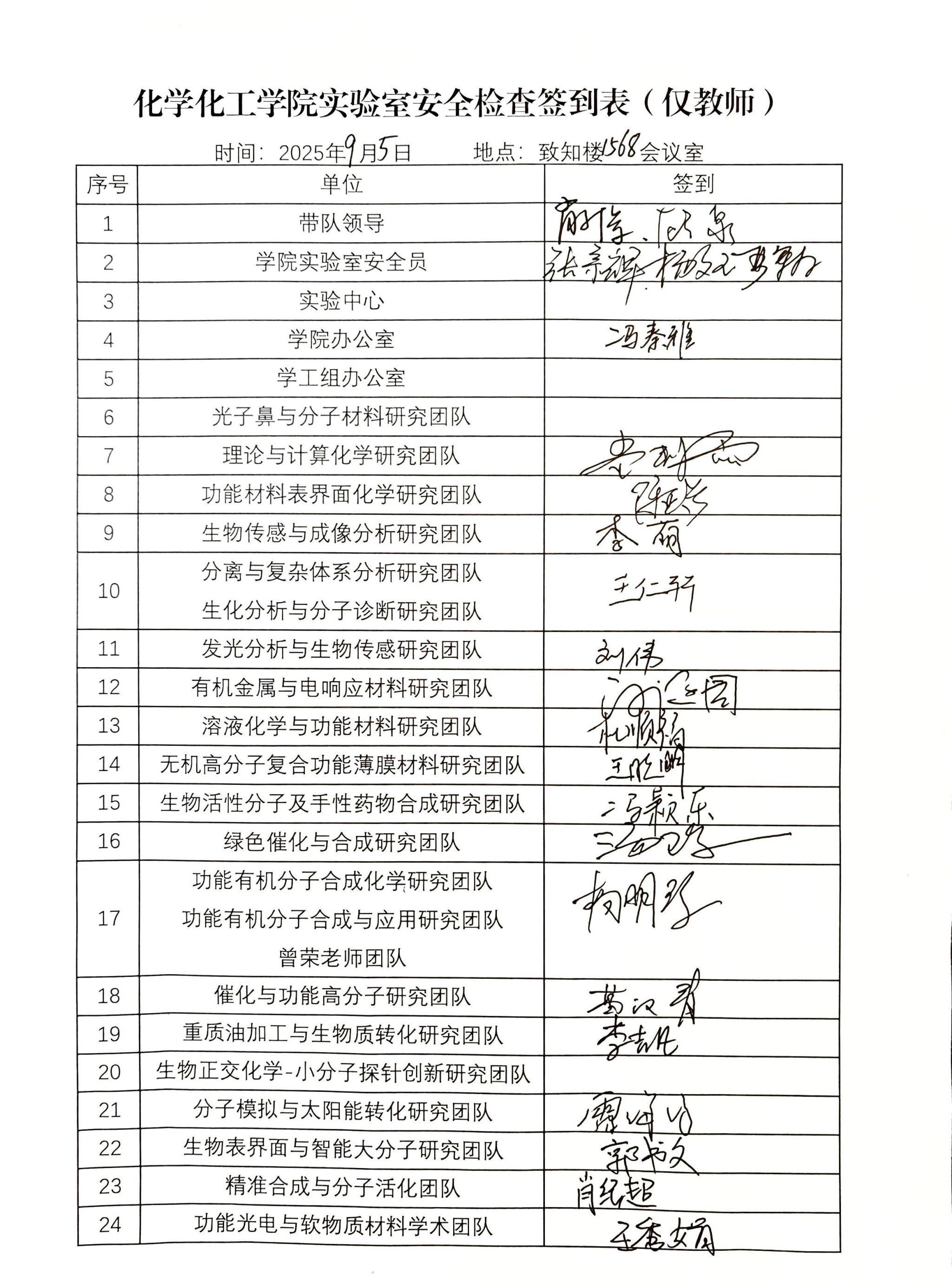 9月5日,学院组织院开展新学期实验室安全检查工作。学院副院长肖新军、顾泉,应用表面与胶体化学教育部重点实验室副主任严军林,安全工作委员会副主任杨文玉,各科研团队教师代表和学生代表等40余人参与本次安全检查工作。
