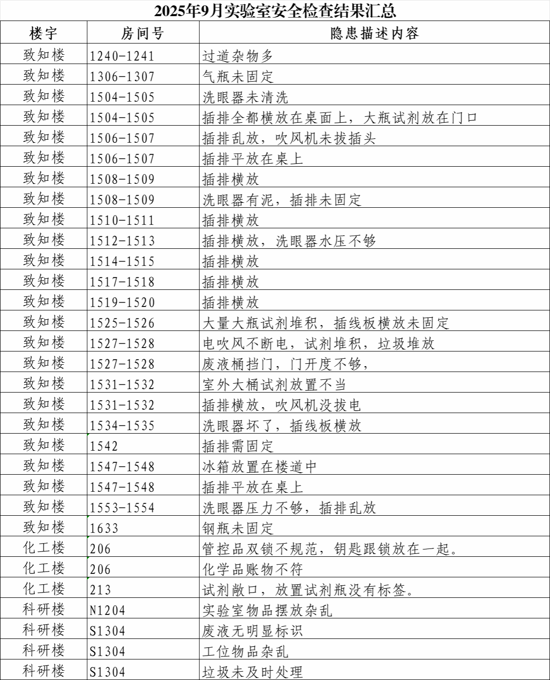本次安全检查发现的主要问题有:用电不规范,存在用电安全隐患,如插排乱放,电器不及时断电;试剂管理不规范,如管控品双锁管理不严格,试剂瓶敞口、大瓶试剂放置不当等;实验室杂物堆积,部分实验室杂物堆积在楼道、门口占用安全通道;气瓶不固定、洗眼器未及时清理、维修等。