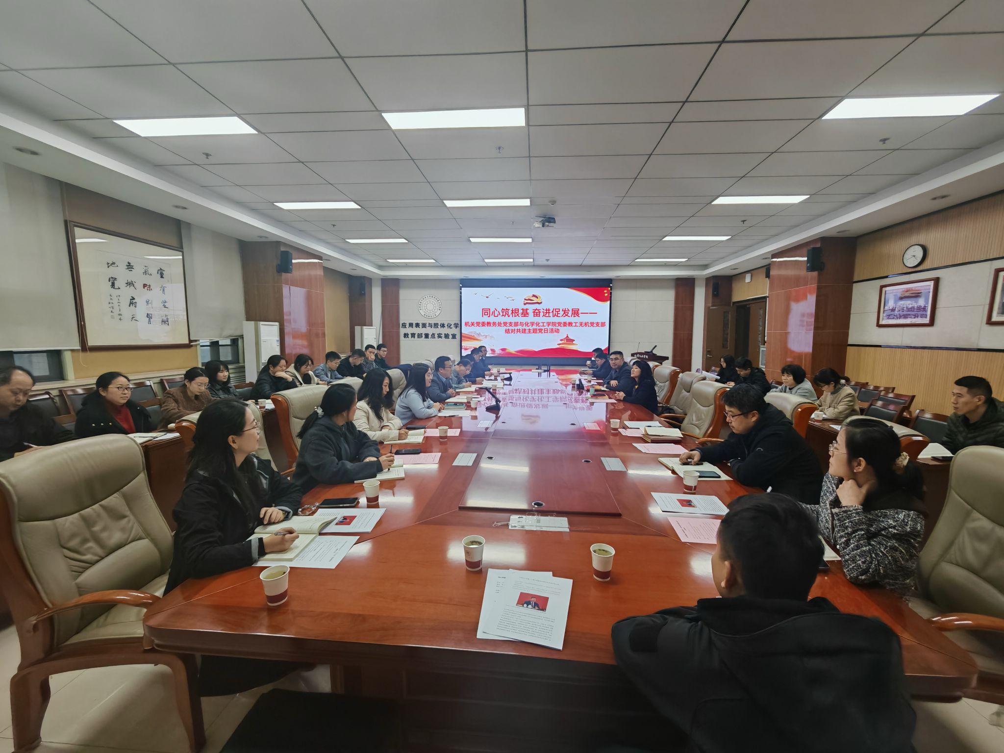 教工无机化学党支部与机关党委教务处党支部在致知楼1568会议室开展了“同心筑根基 奋进促发展”为主题的结对共建主题党日活动。两支部全体党员参加活动,活动围绕支部建设、政策学习、教育教学改革等关键议题展开深入交流,为后续共建工作奠定坚实基础。