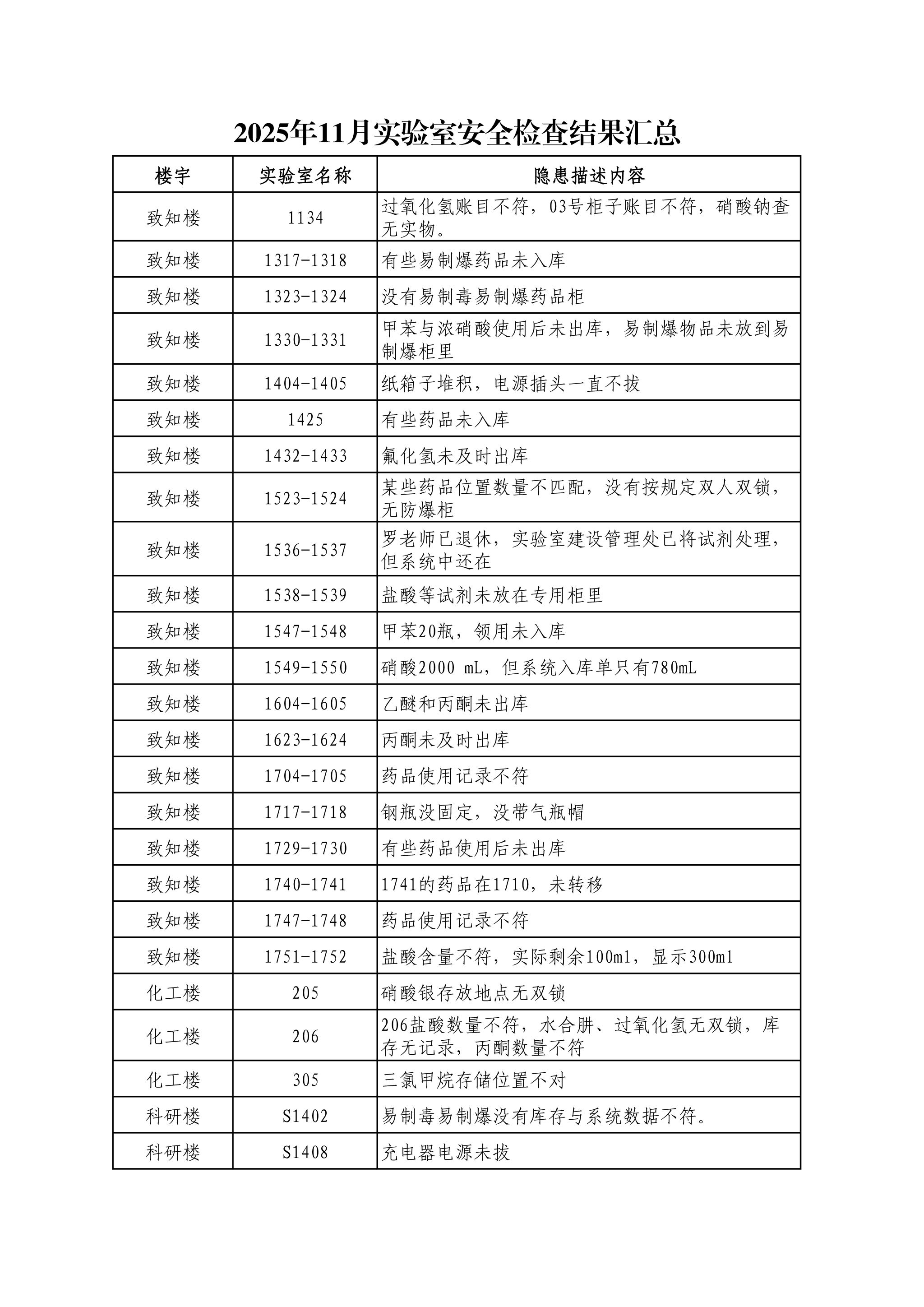 本次安全检查发现的安全隐患主要有药品未按规定出入库、药品账目不符、部分实验室缺失易制爆易制毒药品等。