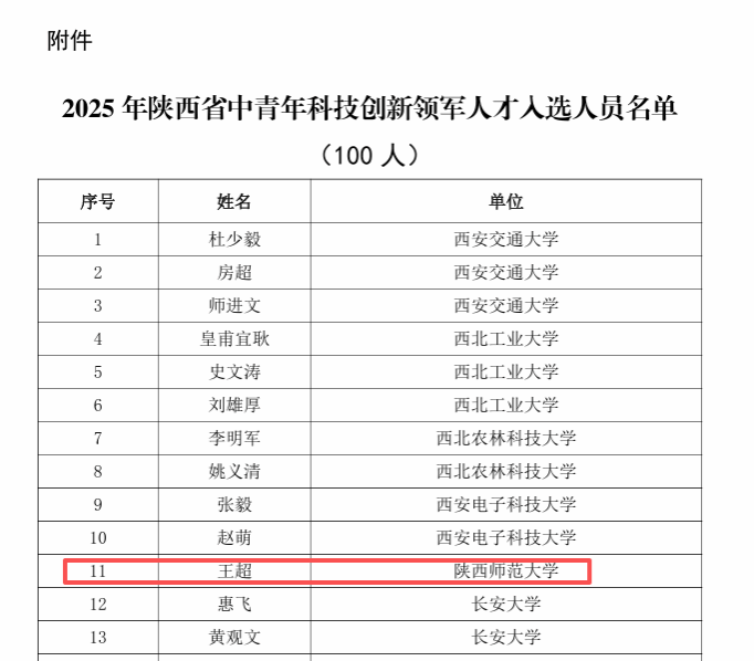 已有5人入选陕西省中青年科技创新领军人才,11人入选陕西省青年科技新星。