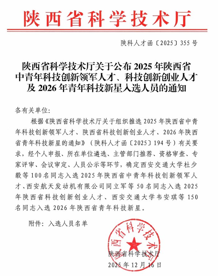 12月16日,陕西省科学技术厅公布了2025年度“陕西省中青年科技创新领军人才”入选人员名单。经个人申报、所在单位遴选、主管部门推荐、资格审查、专家评审、会议审定、人员公示等环节,香蕉视频