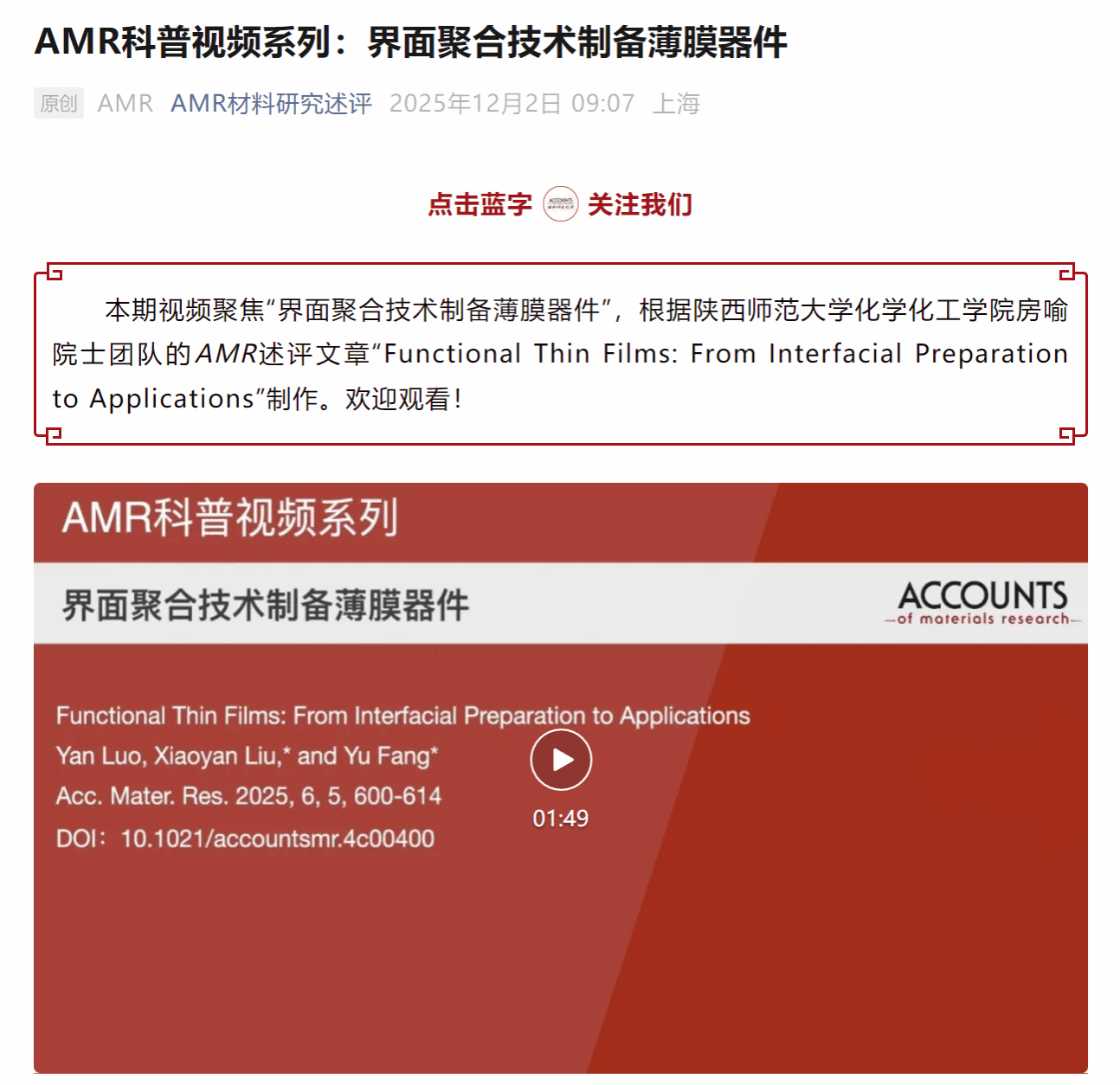 房喻院士团队的AMR述评文章“Functional Thin Films: From Interfacial Preparation to Applications”制作了一条科普视频《界面聚合技术制备薄膜器件》,并在微信公众号“AMR材料研究述评”上发布。