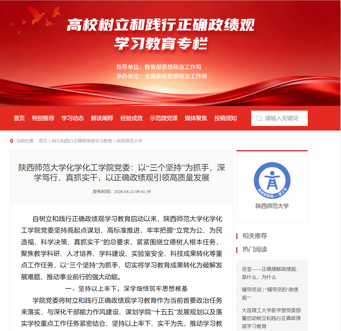 4月21日,《全国高校思想政治工作网》报道学院树立和践行正确政绩观学习教育经验做法:《香蕉视频