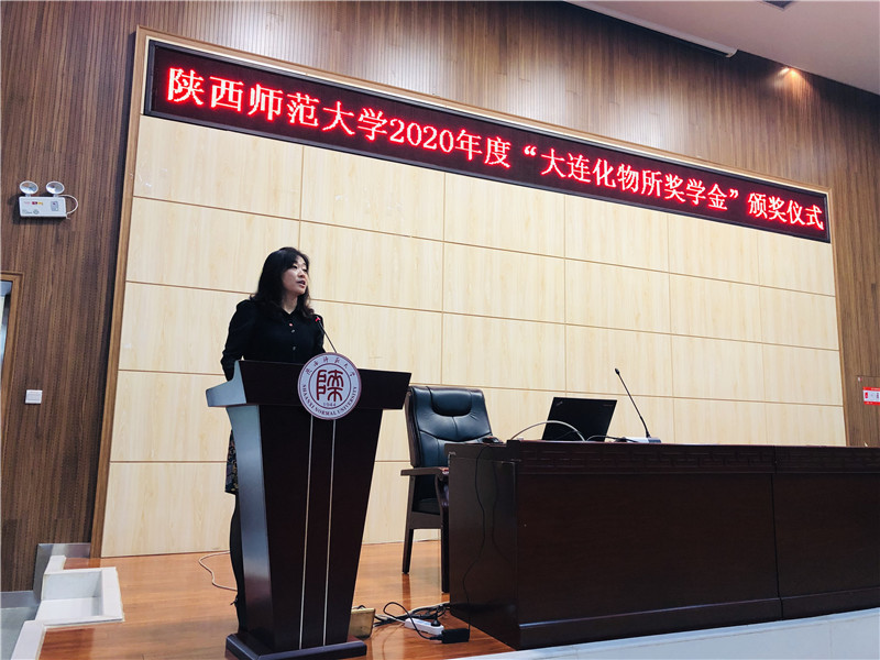 在长安校区文澜楼会议厅举行了大连化物所奖学金颁奖仪式。中国科学院大连化学物理研究所研究生部主任熊博晖、团委副书记杨铎,学院党委书记高玲香、物理信息与技术学院党委副书记曹宇巍,化学、物理、材料三个学院的部分师生参与了此次仪式,仪式活动由学院党委副书记王晓主持。