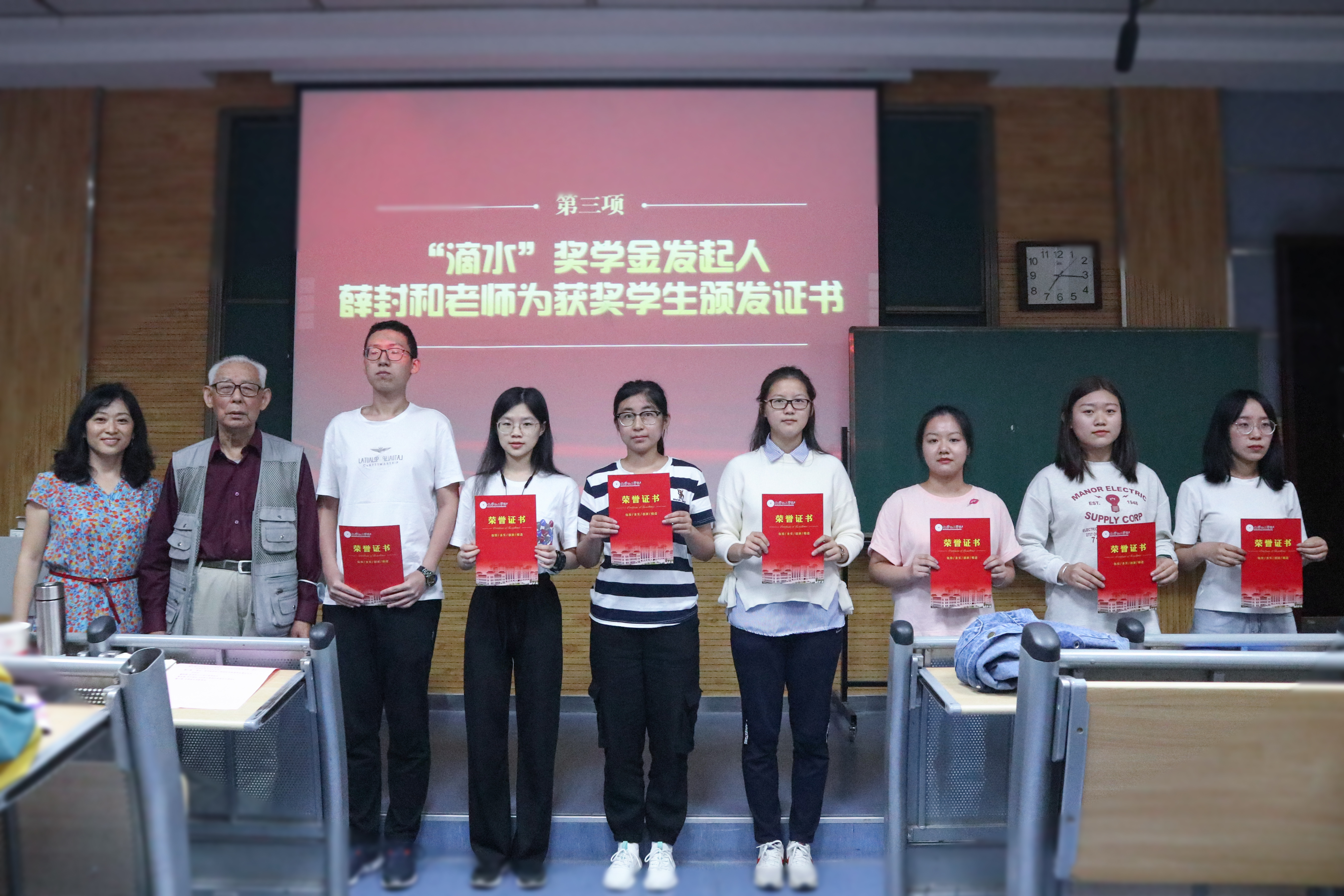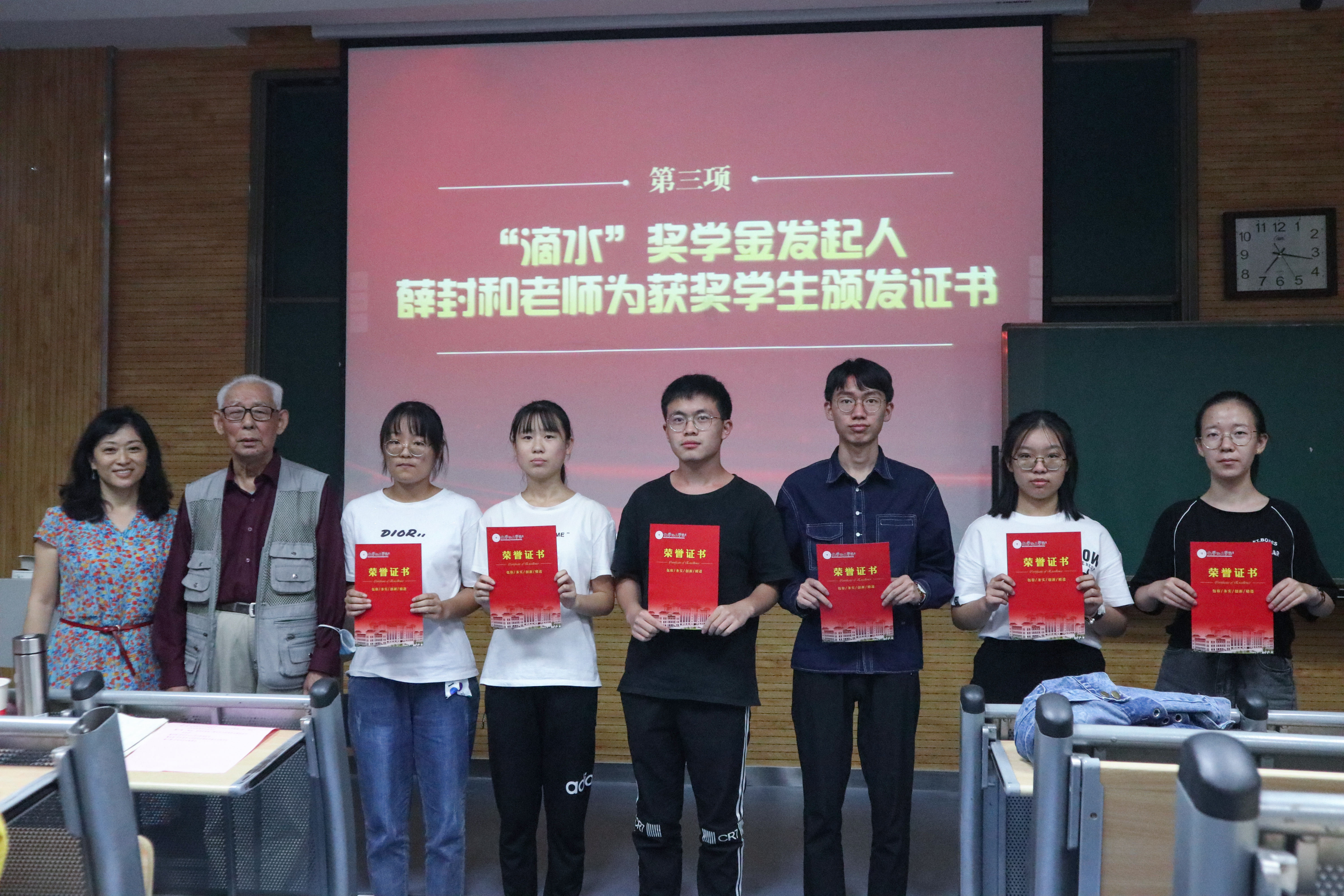 第三届 “滴水” 奖学金颁发仪式在雁塔校区5104教室举行。“滴水”奖学金是由学院退休教授薛封和老师捐资发起的,自2018年成立至今已有三个年头。薛封和老师、学院党委书记高玲香、分析化学教研室主任漆红兰、教工分析化学党支部书记刘伟、2019级辅导员邓文珺及2019级全体学生参加颁奖仪式。颁奖仪式由高玲香书记主持。