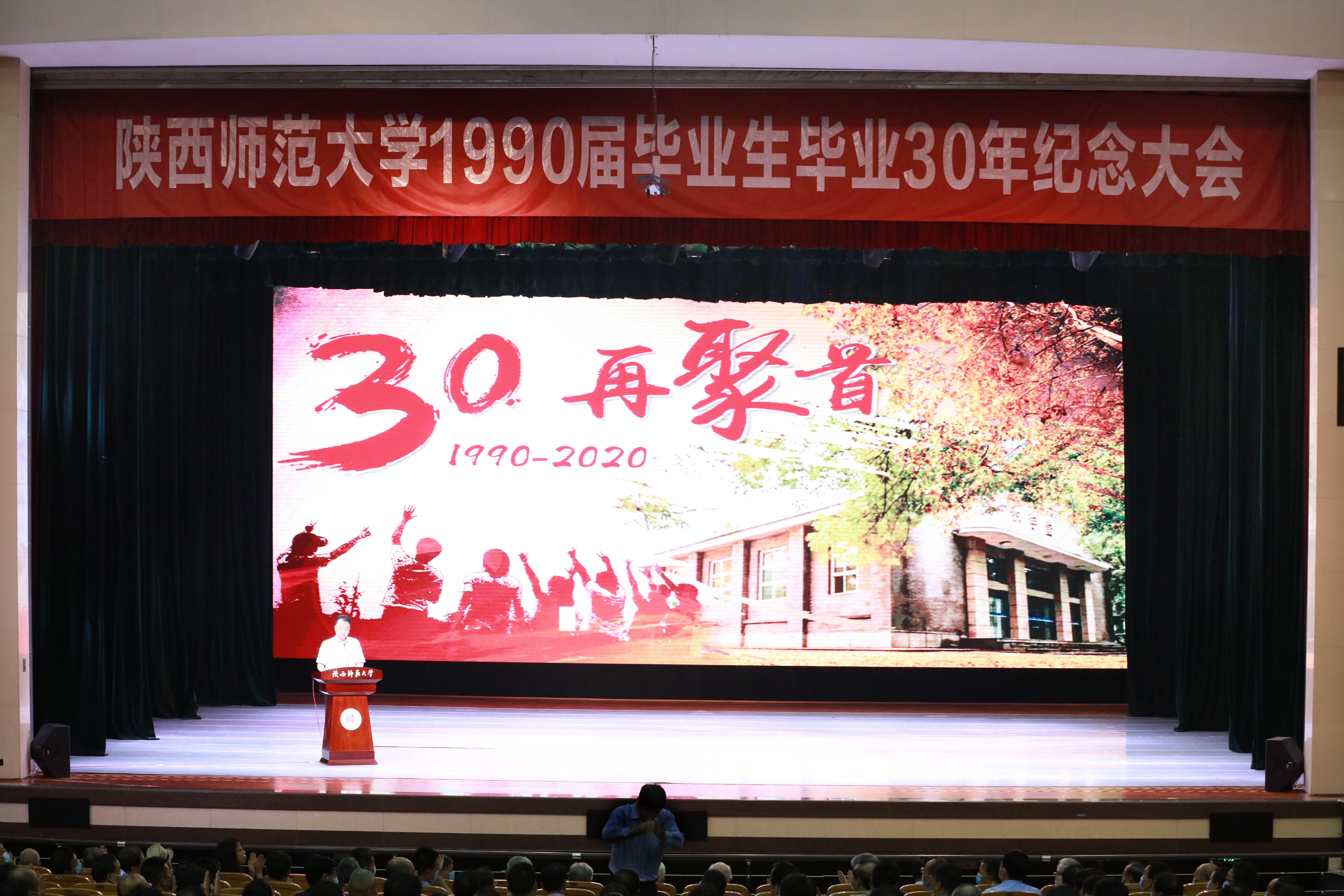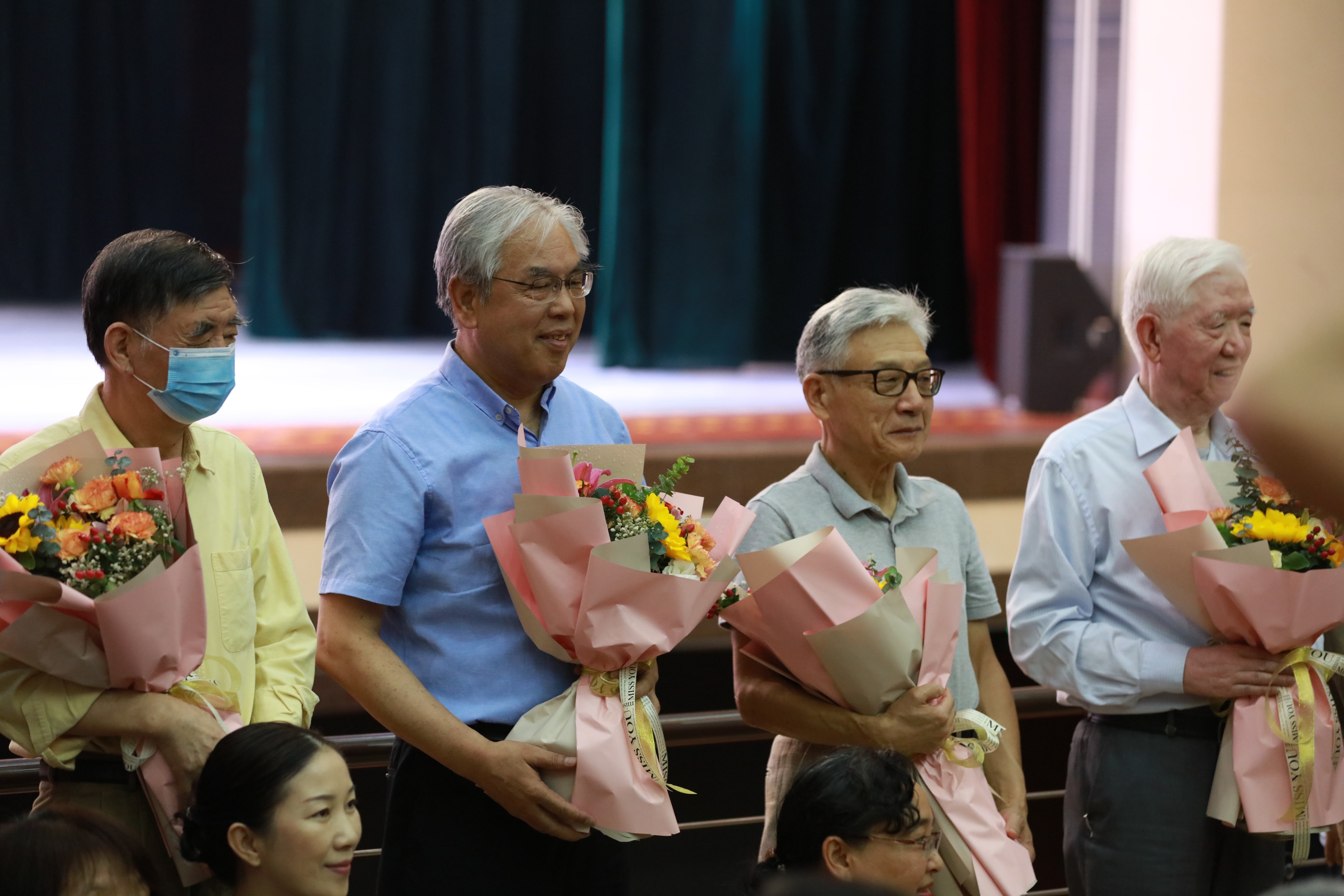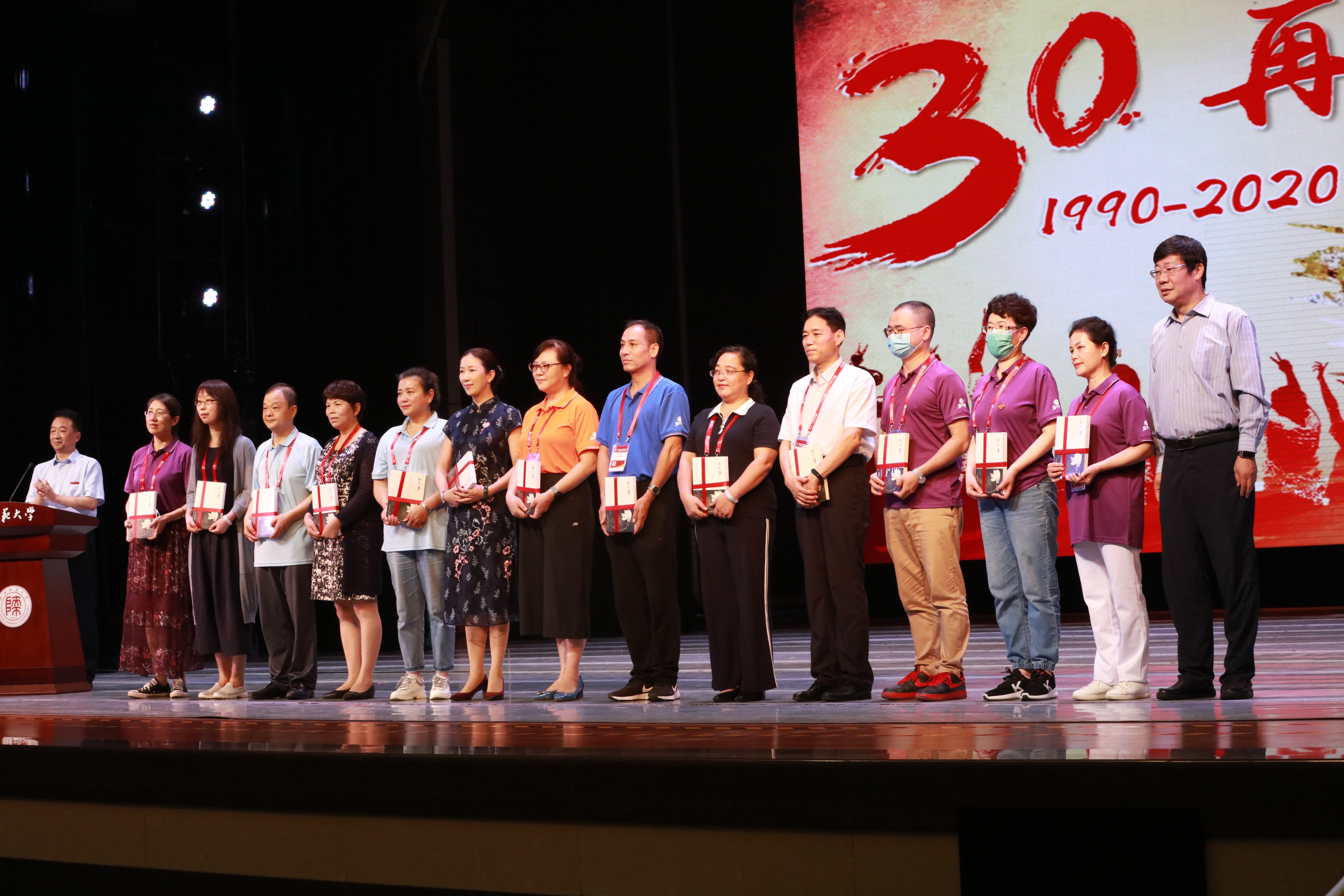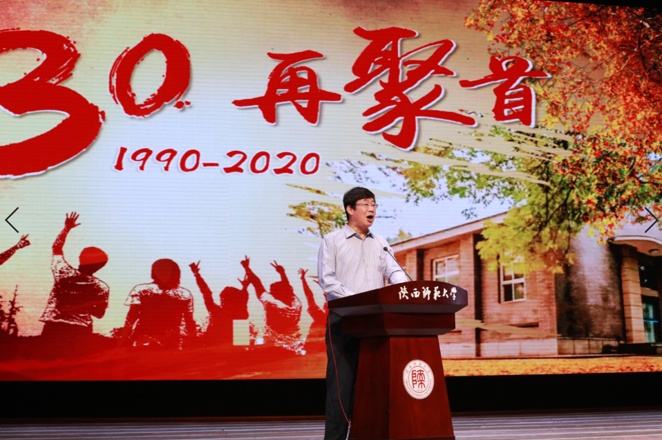 上午9时,化学系90届返校校友乘车从雁塔校区来到长安校区终南音乐厅参加学校1990届毕业生毕业30年纪念大会。学校党政领导,时任校领导、系领导和任课教师代表,各地校友会会长、副会长、秘书长,以及各学院、相关职能部门负责人出席了大会。房喻教授受学校和校友邀请参加了全程纪念活动。化学系90届校友代表王琪为时任教师代表周宝石老师献花,以谢授业之恩、传道之情,并代表化学系校友接受学校赠送的《师大故事》。