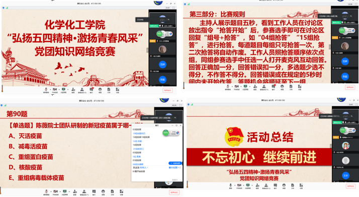 团委以“弘扬五四精神·激扬青春风采”为主题,开展了线上党团知识竞赛。活动分为网络问卷答题和线上会议互动竞赛两种形式,以党史团史、党章团章、党的十九大报告、团的十八大报告、习近平总书记关于青年工作的重要论述、习近平总书记在纪念五四运动100周年大会上的讲话、习近平总书记关于疫情防控工作的系列重要讲话和指示批示精神、习近平总书记给北京大学援鄂医疗队全体90后党员的回信等为主要竞赛内容。