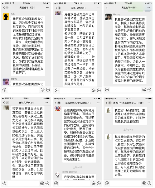 由于团队教师的协作努力,实验课堂教学效果明显,学生满意度高。从学生的整体反馈结果来看,学生对目前科研类虚拟仿真实验课基础类虚拟仿真实验相结合的线上授课模式表现出很强的兴趣与期待。此外,为了后续课程的高效实施,我们还特别注重学生引导学生总结实验收获,展示自己的问题,并提出意见或建议。