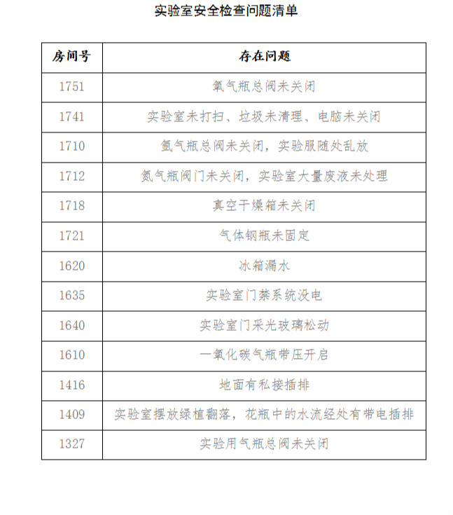 检查组采取逐个房间过、逐个点位查的方式,通过实地查看、亲身操作,先后对学院各楼层科研实验室、化工楼小三层、公共区域,进行包括实验场所安全,安全设施、基础条件安全,实验气体、压力容器管理等内容的细致检查。检查发现,绝大多数实验室对安全管理比较重视,基本能达到疫情期间实验室关闭安全管控标准,但还存在部分实验场所卫生打扫不彻底、物品摆放凌乱、实验气瓶阀门未关闭、插排未断电、少数人员做实验不戴护目镜等突出问题。
