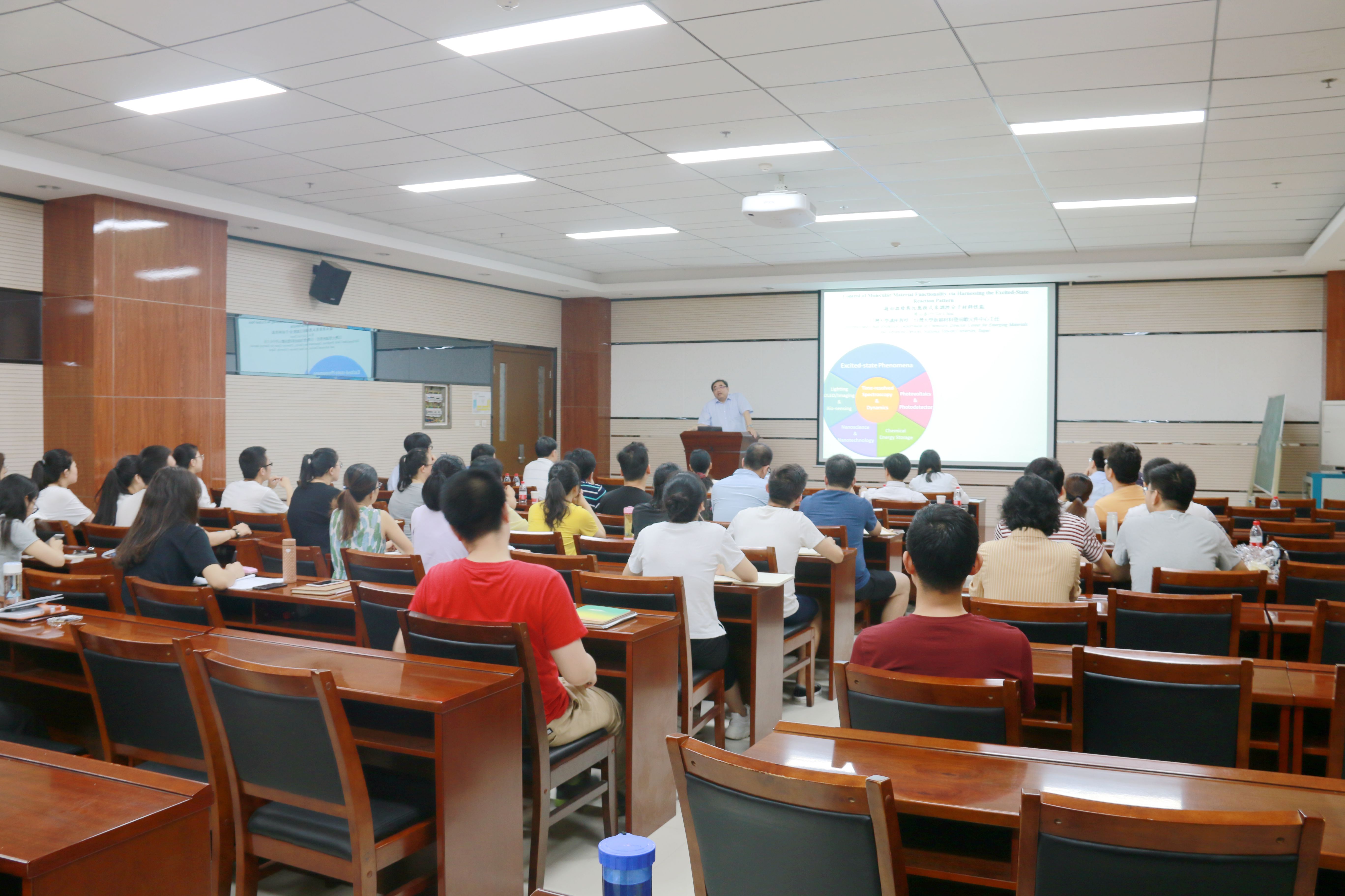 6月20日上午,台湾大学新颖材料暨前瞻元件中心主任,台湾大学杰出教授周必泰应邀访问香蕉视频 ,在致知楼1668报告厅为香蕉视频 师生作了题为“借由激发态反应模式来调控分子材料性能”的报告。香蕉视频 房喻教授、丁立平教授、边红涛教授、尹世伟教授、张成孝教授、刘静副教授、彭军霞副教授、李楠副教授、材料学院胡鉴勇教授及相关专业研究生和本科生聆听报告,报告由房喻教授主持。