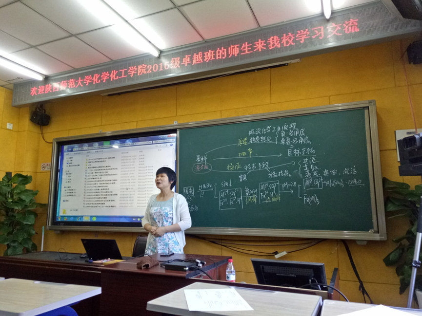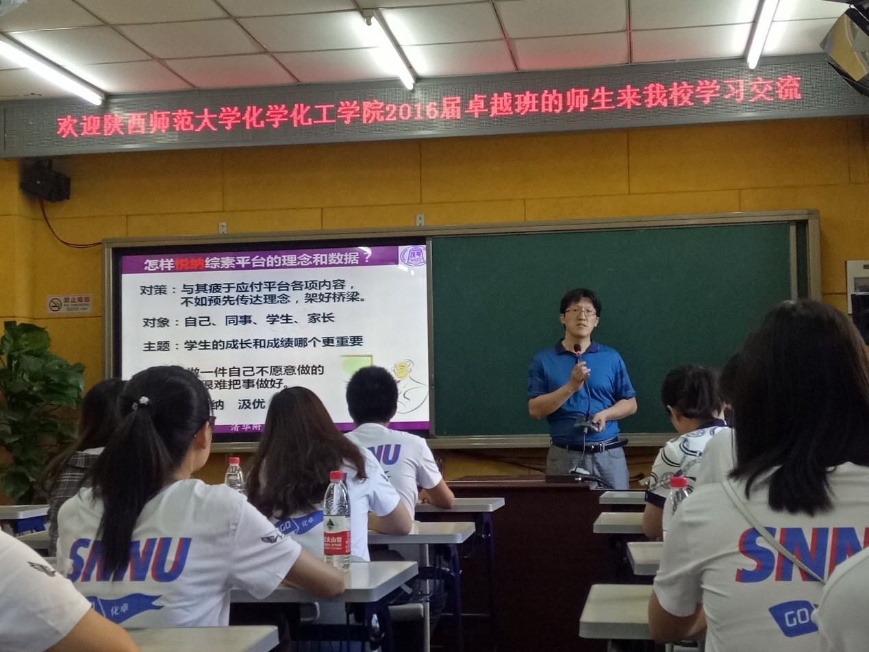 交流会后,大家聆听了杨鹏老师《海水资源综合利用》的示范课,杨老师讲授生动流畅,课堂气氛活跃,本节课以学生设计海水提取溴的工业流程为主线,学生运用教师提供的信息设计自己的工业流程图并展示,而后教师通过演示实验、讲解补充信息、动画等方式引导学生完善自己的工业流程图。课堂知识讲解的十分透彻,让学生知道每个流程的操作步骤、为什么要这样做以及各种方法步骤的发展,在课堂教学过程中也有学生提出不同的问题,杨老师都很自如地控制住了课堂气氛,课后,就如何实现课堂良好管理这一问题,杨老师和同学们进行了深入的探讨。她说了三点:一是老师要有自己的原则,要让学生知道你是有底线的;二是要尊重学生,每一位学生都没有恶意;三是与学生交流,充分了解学生。整个过程下来,同学们收获颇多。