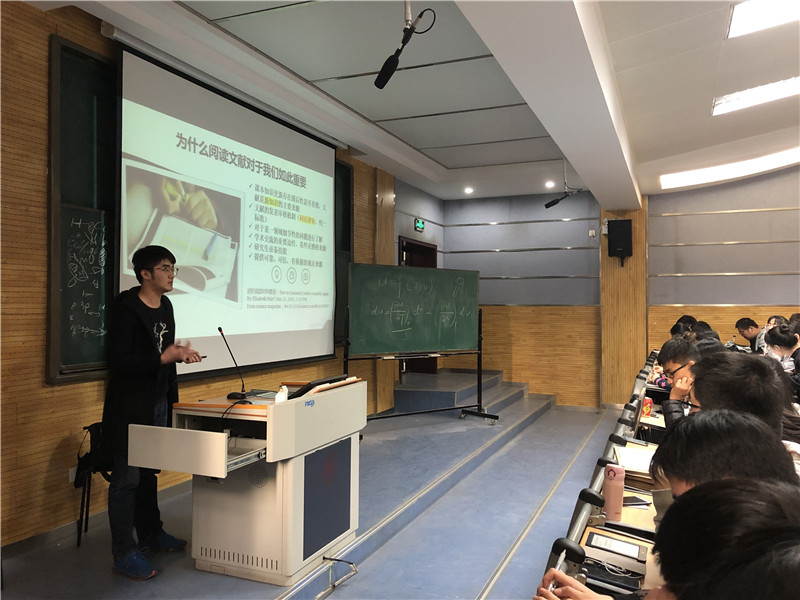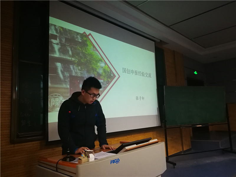 宣传动员,分享答疑。三月初,结合学校教务处的通知要求,2017级召开大学生创新创业训练项目申报动员会。辅导员老师面向全体学生讲解了国创项目是什么、为什么要申报国创项目以及怎样申报科创项目,鼓励大家积极参与其中,并就大家普遍存在的联系导师、团队合作、申报书撰写等问题进行了集中解答。三月中旬,邀请了高年级参加国创项目并顺利结项的学长学姐进行了主题分享,他们结合自身经历讲述了项目答辩、实验设计、英文文献阅读等宝贵经验,使同学们对国创项目的了解更进一步。