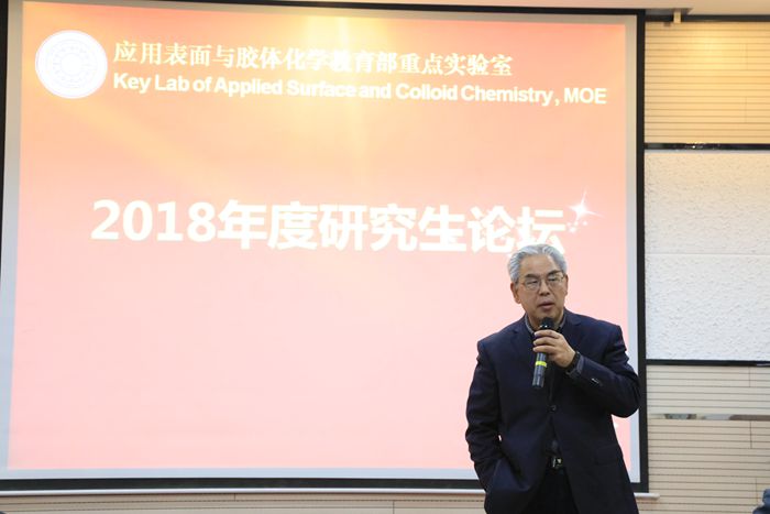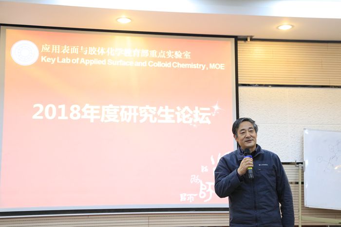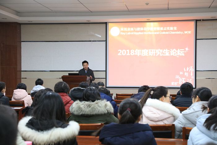 应用表面与胶体化学教育部重点实验室举办的2018年度研究生论坛于2019年1月5日在长安校区致知楼1668/1568会议室成功举行。论坛由重点实验室副主任曹睿主持,张生勇院士、房喻教授、白俊峰教授、张成孝教授、薛东教授、丁立平教授、雷志斌教授、唐艳丽教授、蒋加兴教授、张耀东教授、刘成辉教授等重点实验室150余名师生参加了本次论坛。首先,论坛主持人曹睿介绍了本次论坛的基本情况。他说,研究生论坛是重点实验室重要的例会,本次论坛共有25位博士生参加,其中24位是2017级在读博士生,1位是导师推荐的优秀博士生,论坛报告分为两个会场同时进行。本次论坛邀请了张生勇院士参会并讲话,张院士勉励参会学生珍惜时间,勤勉奋斗,努力实现自己的科研理想,并预祝论坛取得圆满成功。