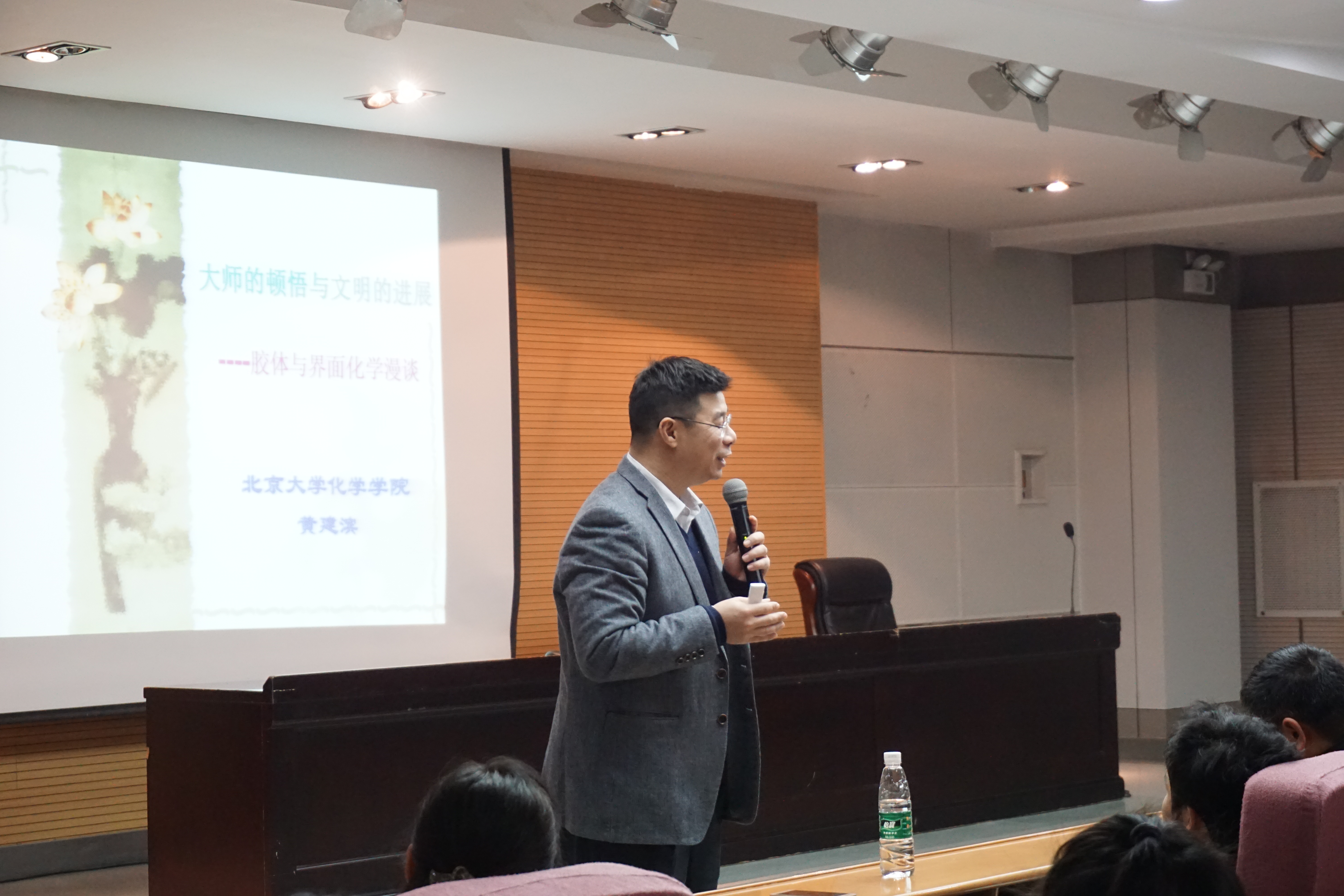 讲座中,黄教授通过胶体与界面化学发展历史上重要关键事件的台前幕后,揭示大师的科学洞察能力、优良的工作习惯以及敏锐的细节观察能力对人类社会发展的关键性推动作用。黄教授讲述了1932年诺贝尔化学奖朗格缪尔传奇的一生,由其研究的方向给我们讲述了关于胶体的概念及来源以及界面对胶体粒子的特殊意义,让同学们了解到胶体特异的定义让它成为学科交叉融合的热点;介绍了开启胶体理论研究的第一人――1925年获得诺贝尔化学奖的德国化学家席格蒙迪,让大家了解了胶体与界面化学的发展历史;通过美国科学家富兰克林在小池塘水面上倒了一勺植物油的事件,循循善诱地给大家讲授了单分子薄膜对水面波的干涉;最后,他引导同学们现场表演,用一个搞笑、惊悚、现实的神话故事来讲解表面张力,让在场同学印象深刻。