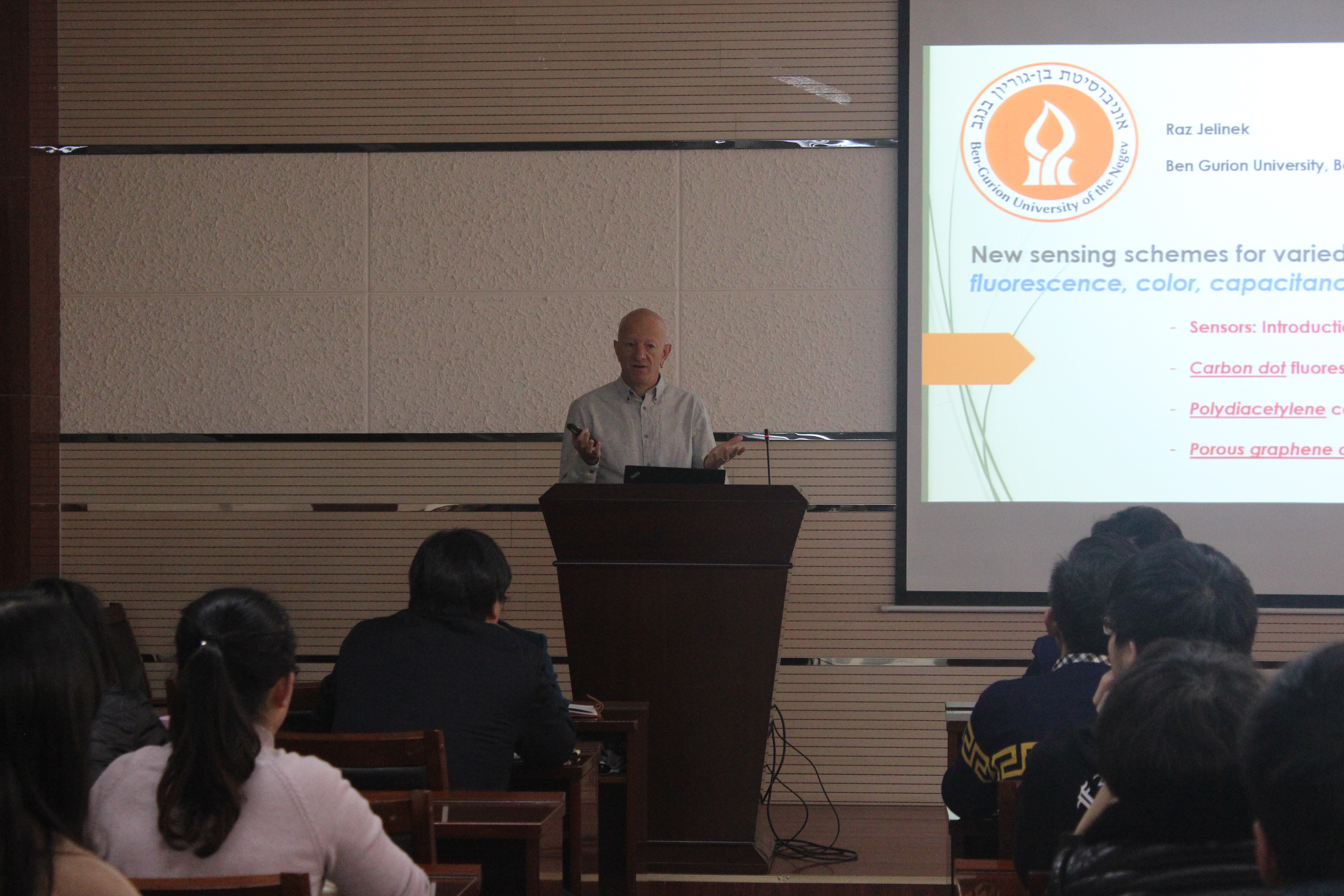 师生介绍了传感器的发展历程及其广阔的应用市场前景,随后他分别介绍了碳点荧光化学传感器、聚二乙炔颜色传感器和多孔石墨烯氧化物气体传感器等研究内容。报告结束后,Raz Jelinek教授与在座师生就相关学术问题进行了热烈讨论,此次报告使香蕉视频