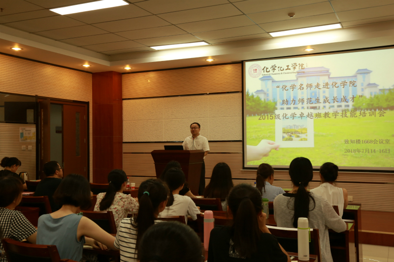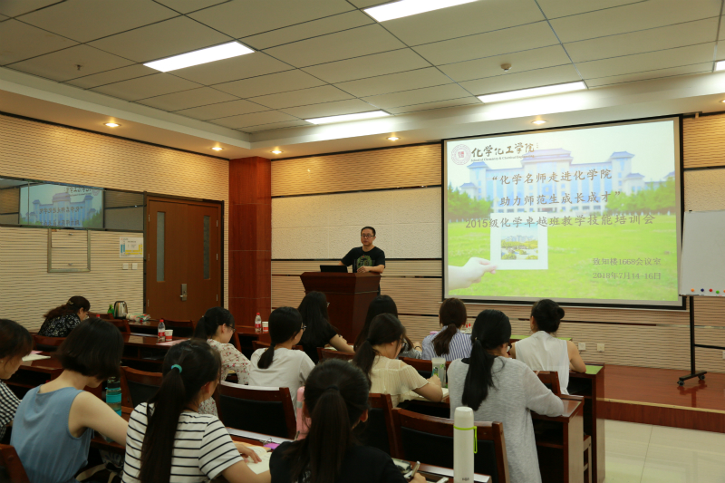 在我校致知楼1668学术报告厅举办2015级化学卓越班教学技能培训会。特邀请西安市中学的六位教学能手为同学们讲授示范课和指导同学们的试讲课,他们分别是西安中学秦才玉正高级教师,交大附中简少国高级教师,铁一中张宁高级教师,西工大附中王刚锋高级教师,高新一中惠青香高级教师,陕师大附中张小茹一级教师。