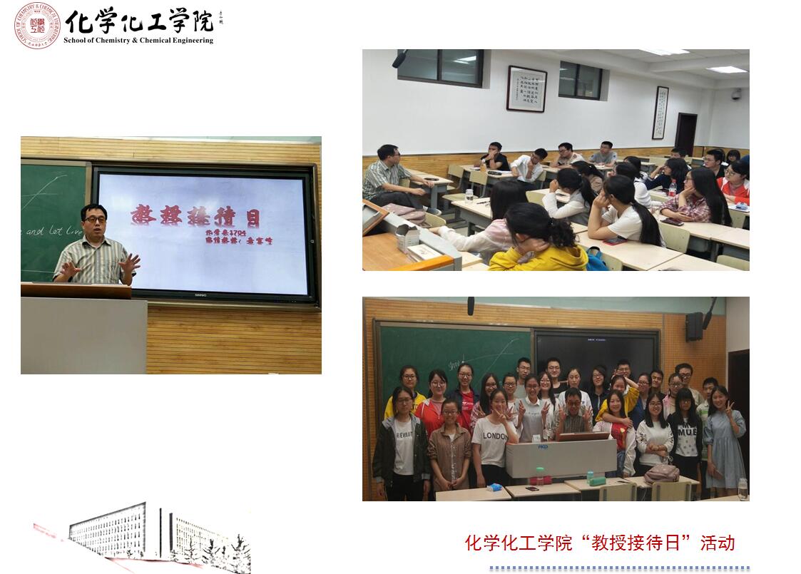 章竹君教授应邀参加了2017级化学二班举办的教授接待日活动。章教授首先讲到了“人生逐梦”的问题,他认为,每个人都要经历梦之大学,梦之人生;作为一名老师,应具备情怀、责任和担当的优秀品质,并鼓励同学们抓住机遇,学好英语,培养自己的创新精神,不断提高自身能力。