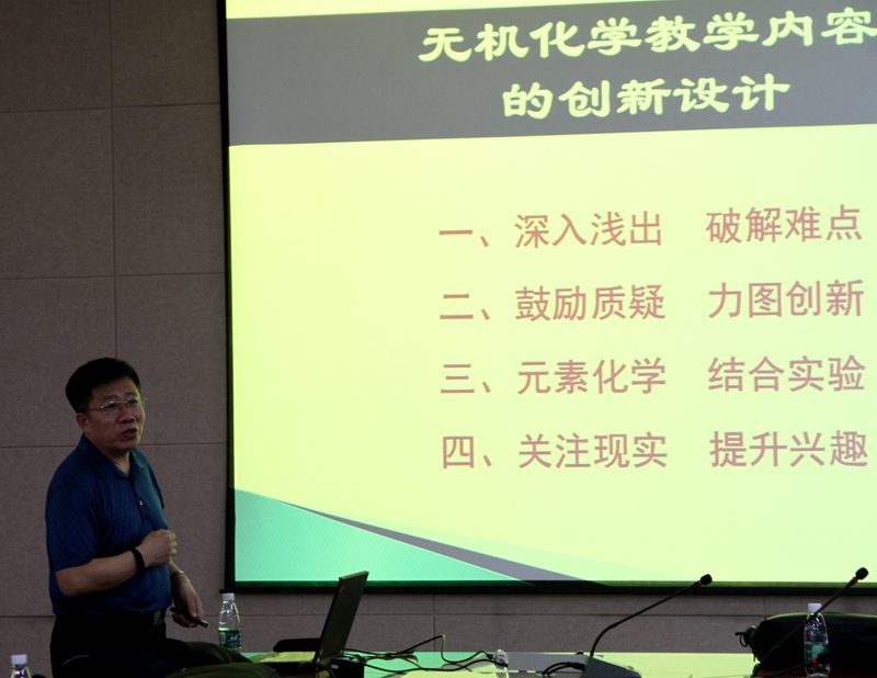 老师分享了自己多年的从教经验。宋天佑教授以“做好教学工作的实践与思考”为题做了报告,他重点总结了吉林大学无机化学教学几十年以来的教学成果,分析了各时代教学方式与观念的变化,对当代新型教学形式--网络公开课及慕课进行了展望。