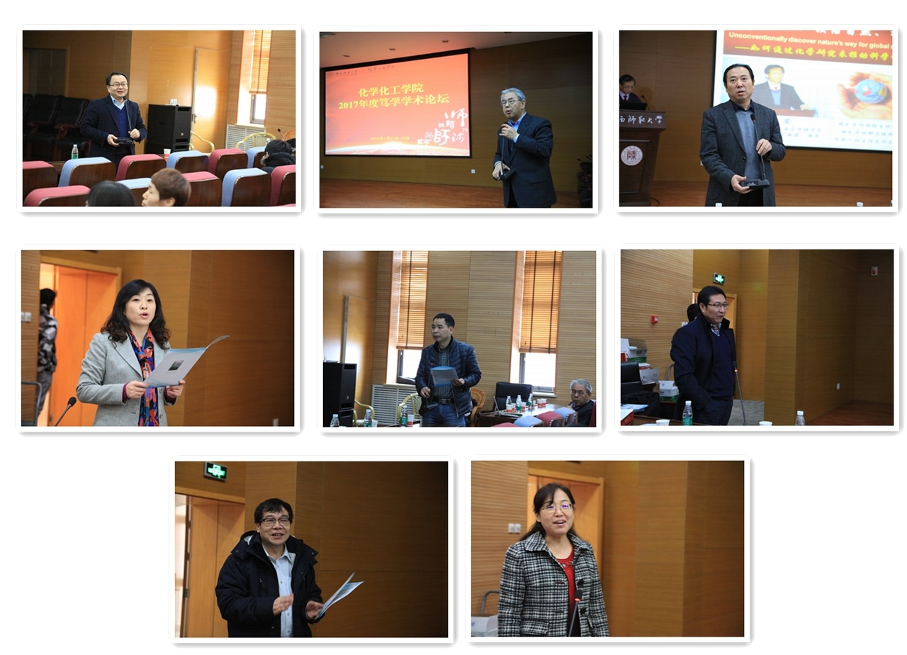在两天的报告会期间,北京化工大学杨万泰院士、厦门大学任斌教授分别作了题为“高分子化学领域几个重大问题研究进展”和“高时空分辨电化学光谱技术”的特邀报告。接着,吉林大学张晓安教授作了题为“逆流而上、领悟自然、推动进步——如何通过化学研究来推动科学和社会进步”的启发性报告。中国科学院上海有机化学研究所李昂研究员、北京低碳清洁能源研究所孙琦研究员分别作了题为“多环生物碱的合成研究”和“新型脱硝催化剂的结构设计和全生命周期管理”的专业学术报告。在报告会期间,学科建设处处长姚若侠就我校的学科建设,相关学科的情况向杨万泰院士做了汇报和交流。杨万泰院士也对我校相关学科的发展和建设向姚若侠处长提出了建议。