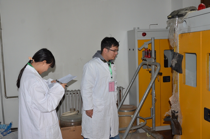 检查组通过实地查看、亲身操作,对实验室废弃物、危化品、防火防盗以及安全设施等方面进行了全面检查,尤其对之前要求整改的项目进行了重点检查。经过检查,教学实验室整体环境整洁;大多数科研实验室地面、桌面无积尘,多数实验人员能够遵守实验操作规范。但是,在检查中也发现仍然有个别实验室存在安全隐患,主要发现的问题有:试剂瓶敞口放置;废液桶未盖;危险化学品柜未上锁;钢瓶未固定;个别实验室门上玻璃和门下通风板被遮挡;实验室放置个人杂物;检查组针对存在的安全隐患进行认真排查,对发现问题现场记录,并要求立即整改。