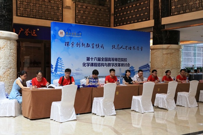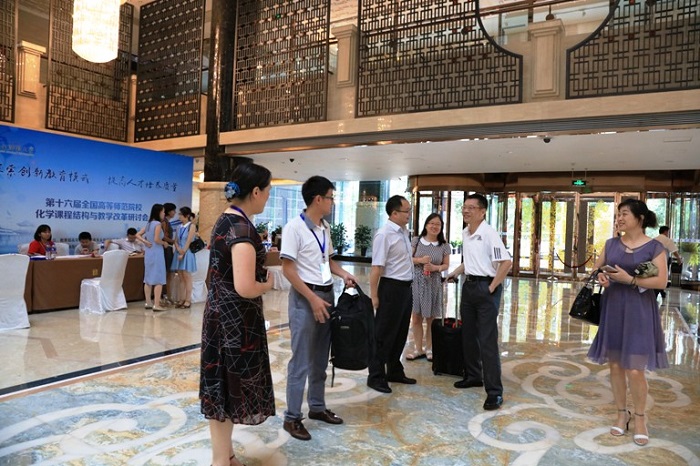 2017年7月21日,由教育部高等学校化学类专业教学指导委员会高师协作组主办、香蕉视频 承办的“第十六届全国高等师范院校化学课程结构与教学改革研讨会”开始正式报到,来自国内外52余家单位的近200名参会者陆续抵达曲江国际饭店签到注册。为了向与会代表提供周到细致的服务,大会组委会精心安排了由多名教师和研究生组成的志愿者服务队接待与会学者,大家以热情的态度和诚挚的笑容让与会代表感受到了宾至如归的温馨。