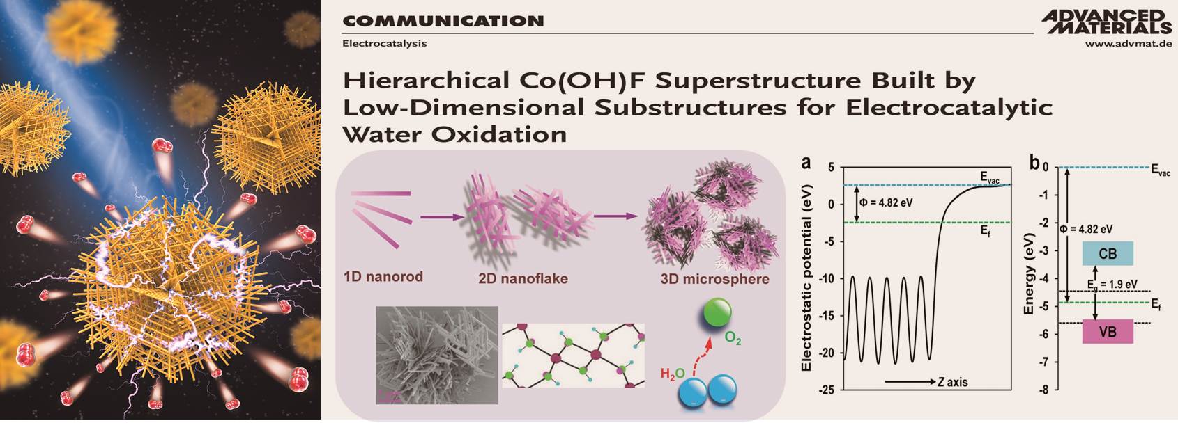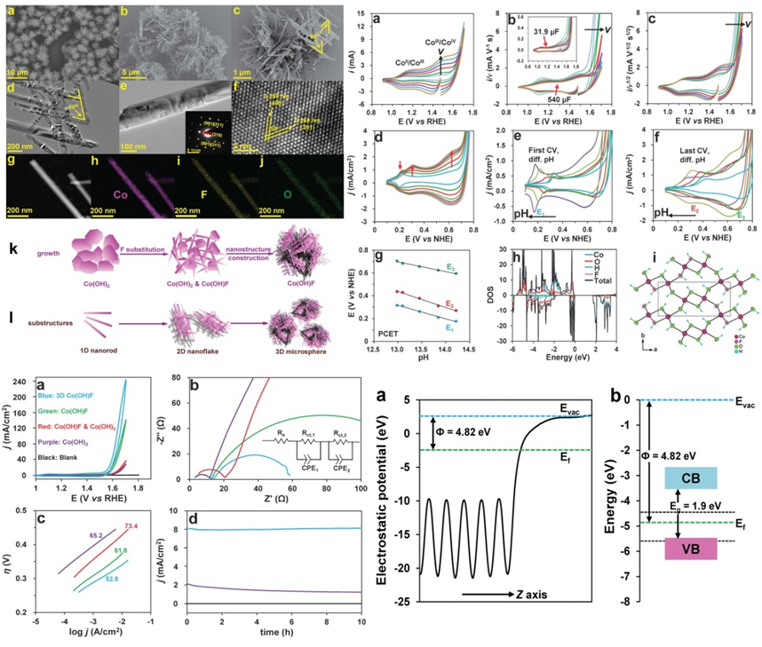 基于前期的系列结果,团队研究人员在开发用于电催化水氧化的新材料与新结构方面进行了大量尝试,并于近期成功合成了新颖的Co(OH)F多级结构材料。该材料是一种新奇的多级组装体系。其基本结构单元为单晶纳米棒,其次级结构为由纳米棒编织而成的多孔纳米片层结构,其高级结构为由纳米片层结构搭建而成的独立微球聚集体超级结构。这种新颖的材料组装形式导致最终结构中同时包含了一维、二维和三维材料特性,这些多维特性在催化过程中均起到明显的积极作用。一维基本单元的各向异性特性带来快速的电荷转移能力、高比例的低能晶面和超高表面积体积比率;一维结构编织的二维单元带来催化过程中快速的传质与传荷;三维超级结构的高孔隙率可以极大提升底物扩散效率。同时,Co(OH)F也是首次被报导为电催化水氧化催化剂。惰性氟配体的引入不仅形成了新颖的组装结构并很好的稳定了催化剂表面结构。电化学及理论计算表明在催化水氧化前表面二价钴被逐步氧化成高价态活性钴中心。该论文的第一作者为香蕉视频
