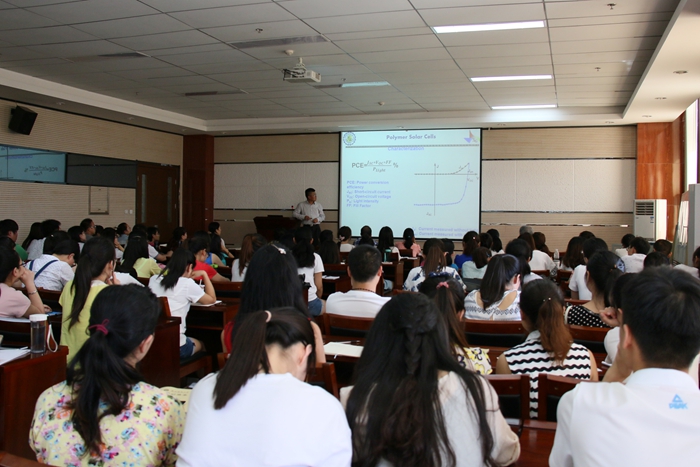 在第一场报告中,巩雄教授在简单介绍导电高分子的发展及其应用情况,更重要的是,他还结合科研工作给我接受了2000年诺贝尔化学奖得主艾伦黑格尔教授和我国曹庸院士的人生奋斗史,给予广大本科生和研究生极大的鼓舞。在第二场报告中,巩教授从聚合物太阳能电池具有的低成本、无污染的特点、聚合物太阳能电池的研究进展、聚合物太阳能电池替代无机太阳能电池的可能性以及设计高性能太阳能电池的手段等方面展开,对自己课题组创新性工作了详细介绍。