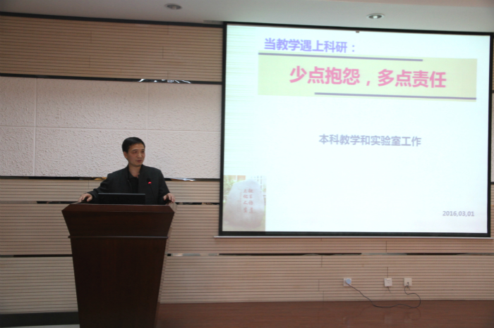 李保新副院长对学院2016年教学工作进行了总体部署。李院长在新学期对全体教师提出三点要求。一是要加强本科教学的过程化管理。学院将建立完善的听课制度,及时了解课堂教学的实际情况,同时加强考试管理,实施“试卷返还”制度,促进学生反思与师生交流。二是要提升青年教师的教学能力。学院将为青年教师配备教学指导教师,举办专题讲座、教学沙龙等活动,促进青年教师不断学习。三是要提高课堂教学的效果。他希望全院教师增强教学责任意识,创新教学方式,激发学生的学习兴趣,引导学生形成良好的学习习惯和方法。