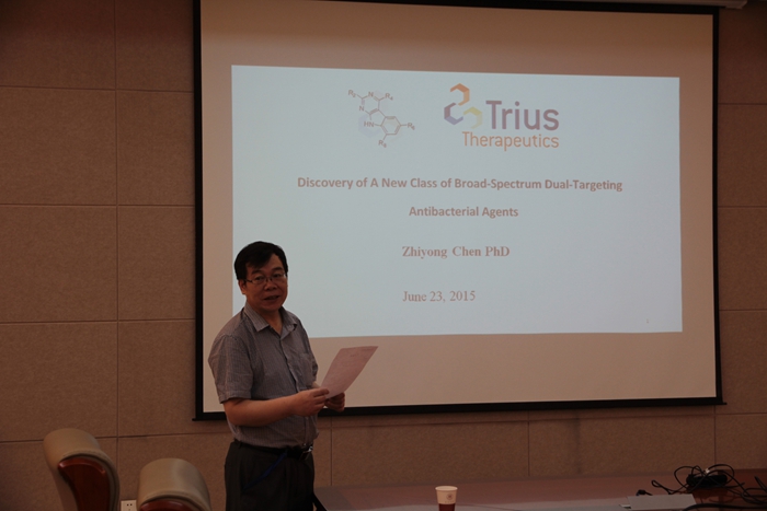 6月23日上午,美国Triusrx Thereapeutics制药公司资深科学家陈志勇博士应邀在致知楼1568报告厅作了一场题为"Discovery of a New Class of Broad-Spectrum Dual-TargetingAntibacterial Agents"的精彩报告。报告会由魏俊发教授主持,李宝林、薛东、杨俊、黄治炎、李楠、俞斌勋、王涛、李夏冰等教师及相关专业研究生、本科生聆听了报告。