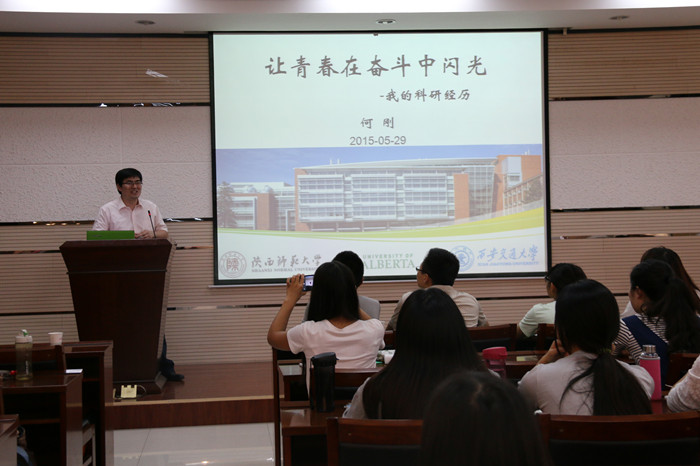 2005届本科毕业生、西安交通大学前沿科学技术研究院何刚教授作了题为“让青春在奋斗中闪光——我的科研之路”的讲座。学院党委副书记王启明、分团委书记陈钿、2012级辅导员牟朝丽及2012级全体非师范生聆听了报告。报告会由王启明主持。