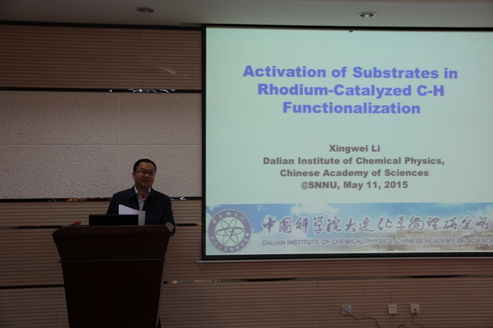 报告中,李兴伟研究员用凝练简洁的语言向在场师生介绍了近年来其课题组在金属铑和铱催化C-H键官能团化所取得的进展和成果,并详细介绍了探索反应机理的方法。李老师将金属有机化学基元反应和催化体系的开发相结合,发展了一系列碳氢活化/偶联的新体系。例如首次实现了芳烃在温和条件下经碳氢活化机理进行的叠氮化、炔基化、高价碘化、氧原子转移等体系,克服了碳氢活化中定位基功能较为单一的局限,提出了多功能化定位基的概念,实现了碳氢键活化和其他重要领域的融合,具有较强的科学意义和潜在应用价值。李兴伟研究员的报告深入浅出、内容丰富、逻辑性强,引起了与会师生的强烈共鸣。