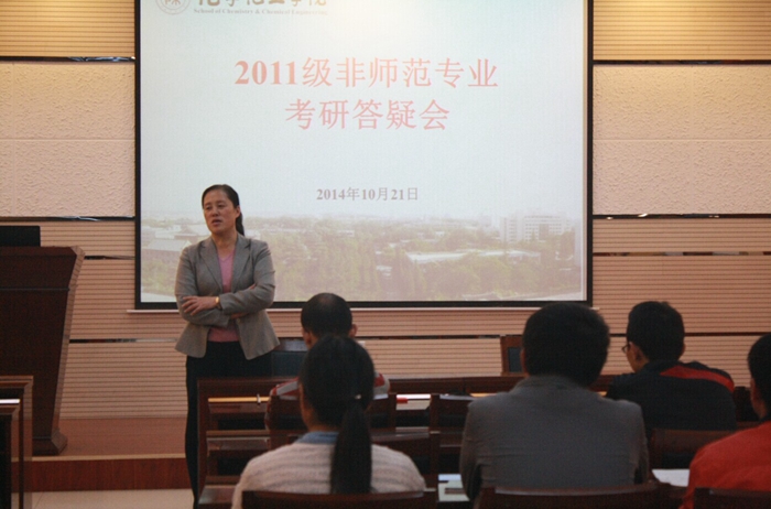 2011级非师范专业本科生考研报考志愿有些集中,考研学生应根据自身情况正确选择报考单位,增加考研录取的把握。最后,焦桓教授和张小玲老师就考研过程中的具体问题与同学们交流讨论,并积极回答了提问。
