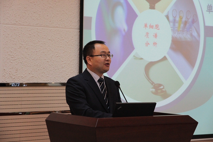 82届本科毕业生、英国皇家化学会会士、清华大学教授张新荣首先为在场师生作了题为“单细胞质谱分析方法研究”的报告。张教授通过展示一篇篇优秀的学术文章分别介绍了单细胞质谱分析的意义、目前所面临的困难以及分析方法的前沿发展。他指出,单细胞探针点喷雾质谱分析将成为未来该领域的一个新研究方向。