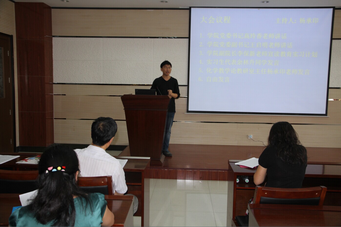 首先,高玲香书记强调了教育教学实习的重要性,希望同学抓住宝贵的锻炼机会,希望同学们明确目标,审视和检查自己,就自己的薄弱环节针对性地重点锻炼,量身打造自己的实习计划。王启明副书记重点强调了实习期间的安全问题和实习纪律,指出实习生是代表了学校、学院形象,言谈举止都要得体大方,王启明副书记要求全体学生实习期间严格遵守实习纪律,保证信息通常,保持联络。李保新副院长宣读了教育实习计划,同时对教育教学实习做了较为概括的介绍,指出教学实习环节是大学生教学技能培养的核心环节,作为大学生要具备扎实的教学基本功,提升知识深度和广度,要做到专业知识自信,保证所传授知识的科学性和准确性,希望同学要勤于虚心向指导老师请教。随后,2011级化学2班余林升同学代表本级实习同学发言,号召同学们勇于担当,以教育为己任,团结奋进,不辱使命,完成教育教学实习,以优异的成绩来回报母校的培养和实习地师生的信任。最后杨承印老师结合实习中具体事例,详细讲解了实习工作中的重要问题:重视安全问题,以教育教学实习为核心人物,人际关系从简,加强与实习基地老师的沟通,重视教育调查报告,注重教学反思。通过本次动员大会,使2011级实习生更加明确了实习的要求和方向。