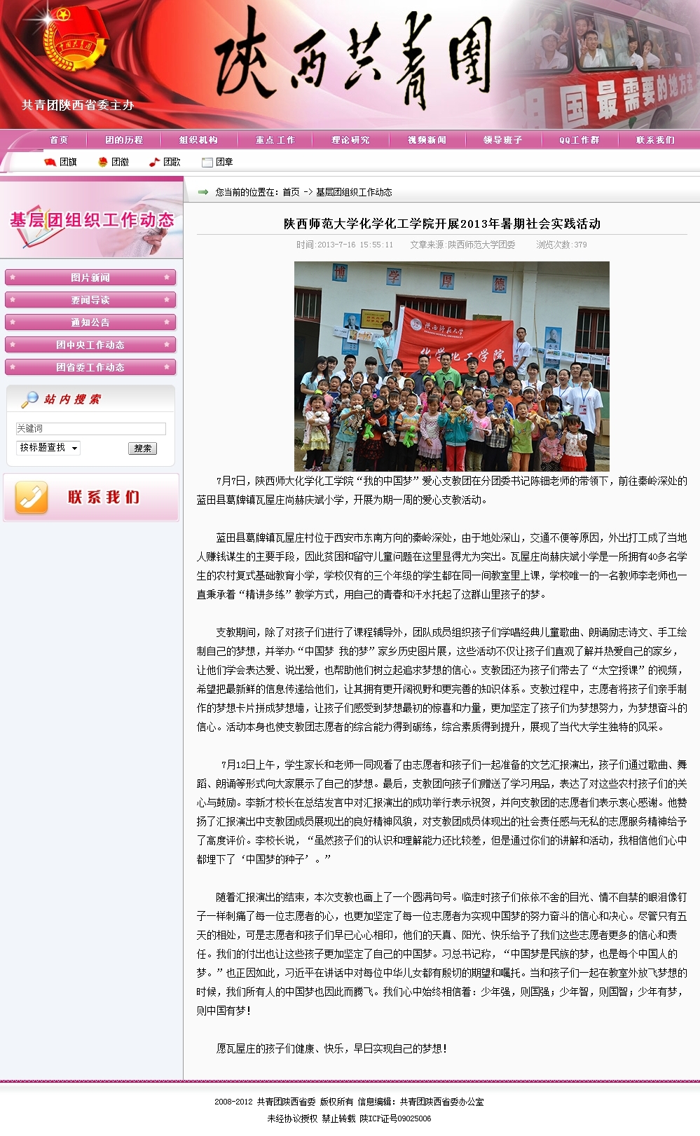 2013年暑期,学院团委积极响应中宣部、教育部、团中央和全国学联的号召,根据校团委“实践激扬青春志,奋斗成就中国梦”的社会实践主题,围绕“按需组队,点面结合,突出重点,双向受益,项目运作,重在实效”的原则,在学院范围内积极宣传、动员、组织和策划,组建了“我的中国梦”爱心支教团队获得校级重点项目资助,学生自组团队“陕西农村留守儿童生活和受教育状况调查研究”团队获得校级特色项目资助。整个暑期,同学们深入基层支教支农并走访调研,不但在服务社会的过程中提升了素质与能力,而且还增强了社会责任意识和使命感。2013年,香蕉视频