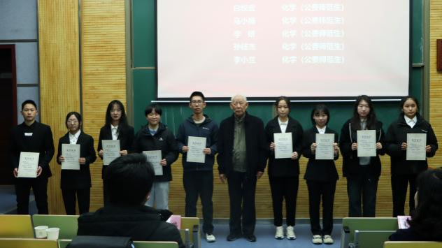 贾颍辉介绍了滴水奖学金的发起和设立情况。“滴水”奖学金由薛封和老师于2018年捐资发起,主要用于奖励分析化学实验中勤奋刻苦、动手实践能力强、品学兼优的本科生。薛封和老师退休三十余年来,心系学院发展和分析化学学科建设,关心支持青年学生成长成才,以多年来对教育事业的深厚情怀和无私奉献,激励着同学们向优秀和榜样看齐,奋发向上,积极进取。