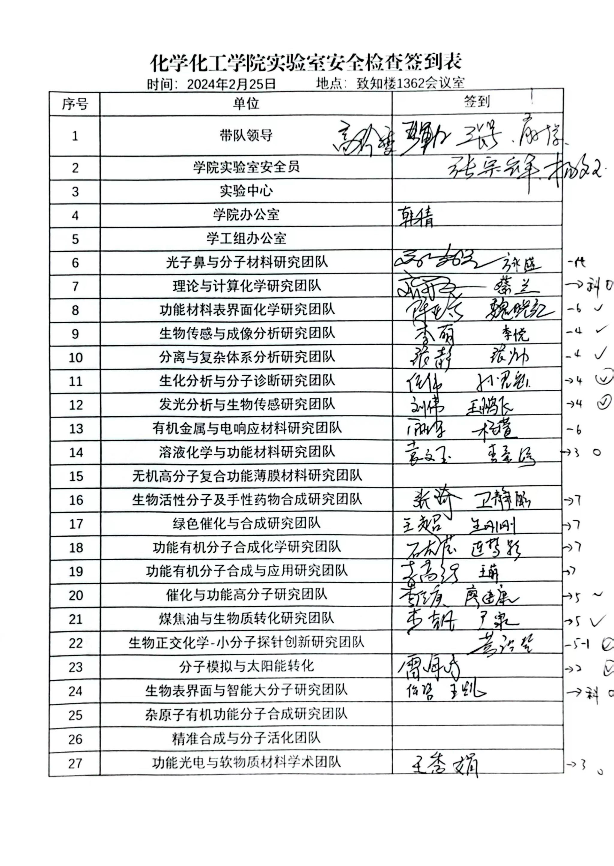2月25日上午,学院进行了新学期实验室安全检查工作。此次检查以安全用电、废弃物处理、易制毒/易制爆物品储存为重点内容,由学院党委书记高玲香、副院长肖新军、副院长王长号、应用表面与胶体化学教育部重点实验室副主任严军林、安全工作委员会副主任杨文玉带队,各科研团队教师代表、学生代表约30余人参加。