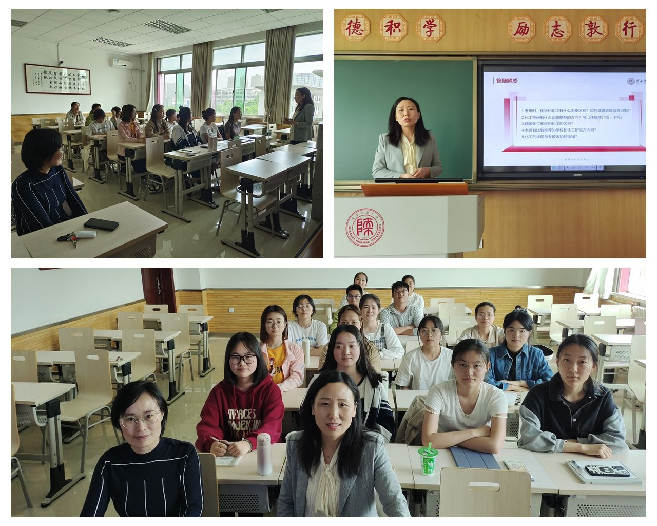 2024年4月19日,化学(优师)2201班邀请刘静教授参加教授接待日活动。刘老师给同学们分享自己的求学经历和工作经历,并就提前收集的问题进行回答。刘老师强调物理化学课程的学习需要将课堂学习和课后做题相结合,做到学练相统一,达到两者的平衡。刘老师提醒同学们要在日常生活中保持自律,不要沉迷网络,有压力不要陷入不必要的精神内耗,要掌握自己排解压力的方法,及时找回状态。刘老师勉励同学们一定要抓紧当下的时间,不断丰富自己的知识储备,为将来的教师生涯做好准备。本次教授接待日的召开,解决了同学们学习生活上的问题,也坚定了同学们立志躬耕教坛的信念。