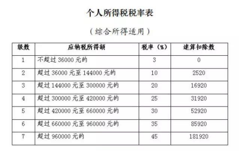 注:(1)专项扣除:指三险一金等;(2)专项附加扣除:包括子女教育、住房贷款利息、住房租金、赡养老人、继续教育、大病医疗共六项;(3)依法确定的其他扣除:包括个人缴付符合国家规定的企业年金、职业年金,个人购买符合国家规定的商业健康保险、税收递延型商业养老保险的支出,以及国务院规定可以扣除的其他项目。(4)税率及速算扣除数见“个人所得税税率表”。